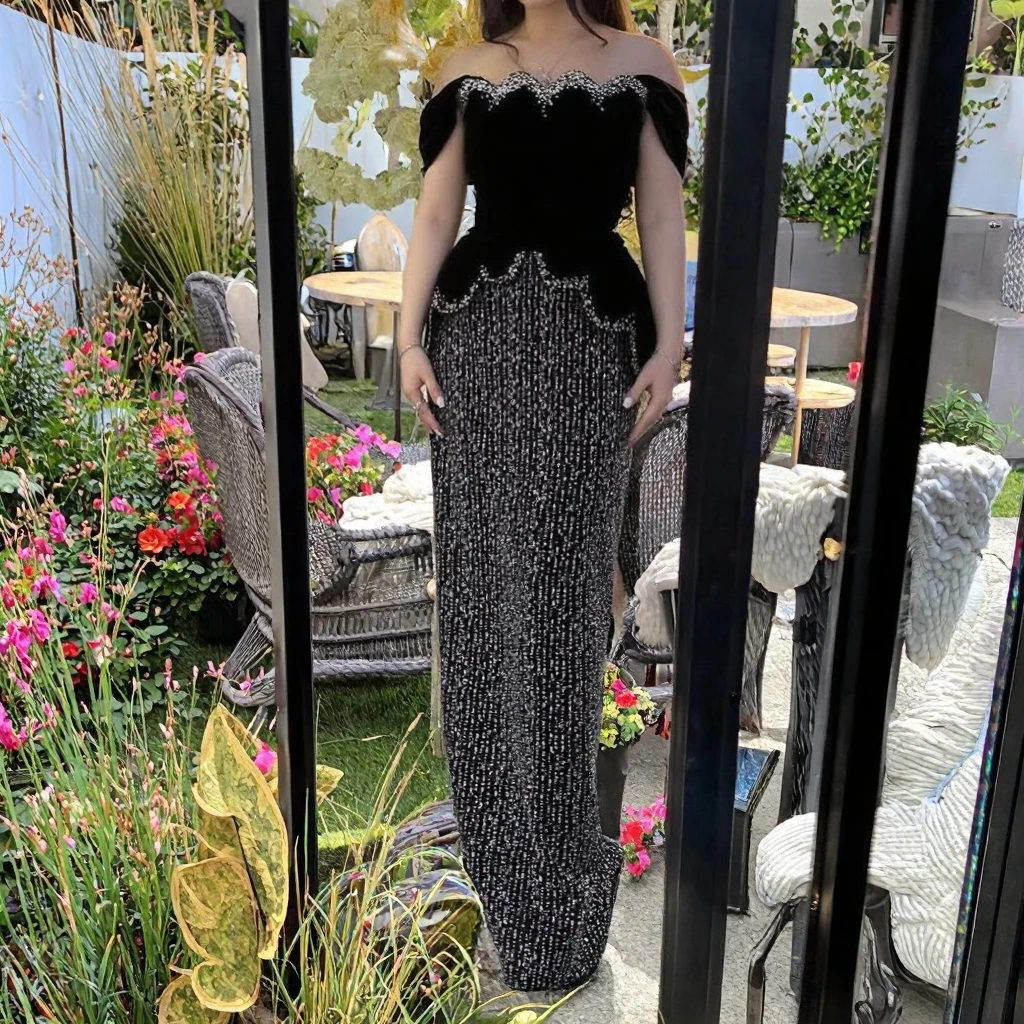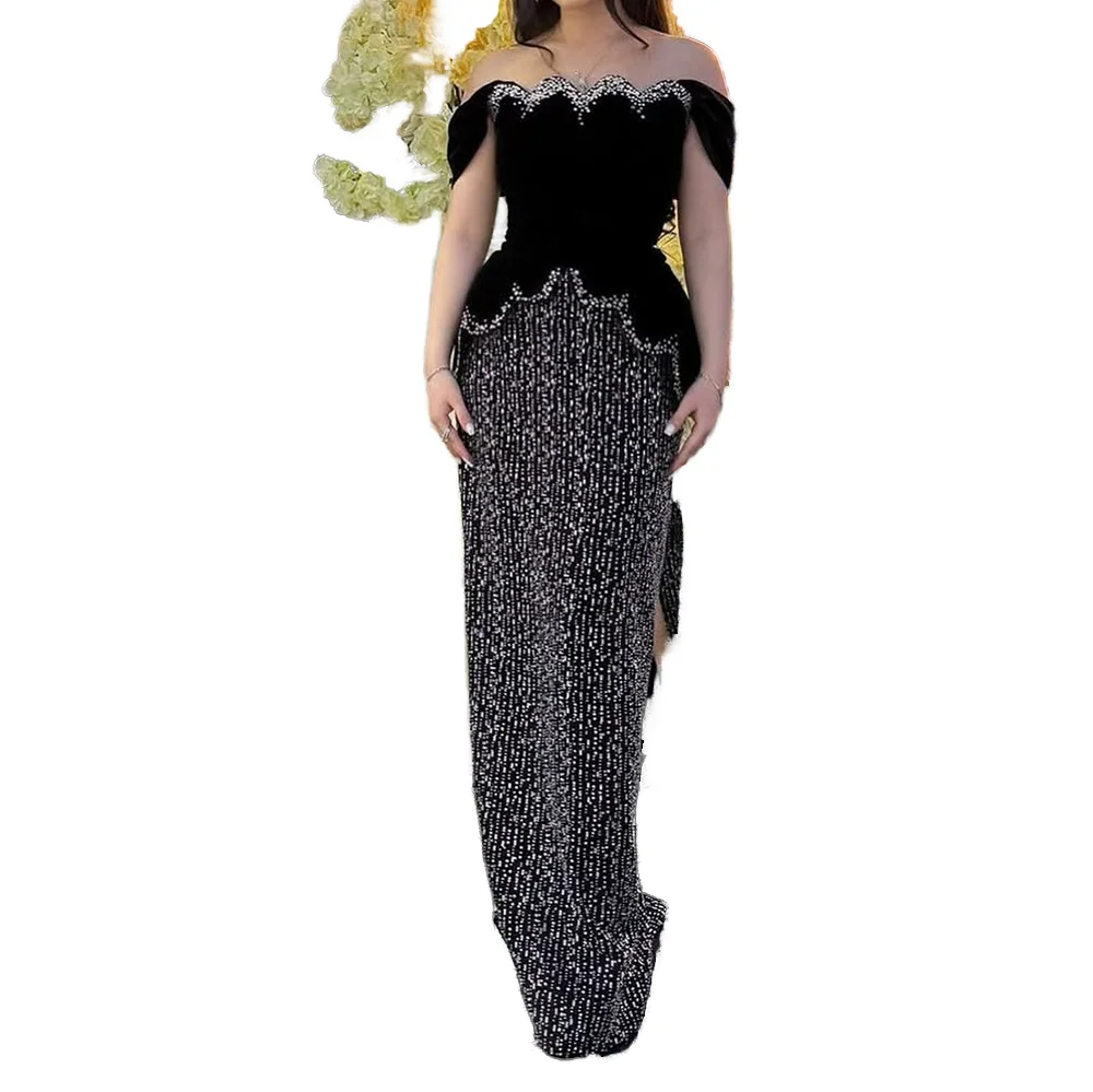 Customize Women Simple Straight Sexy Shoulder Pearl Diamond Black Long for Two Piece Set Elegant Evening Party Club Gowns Dress