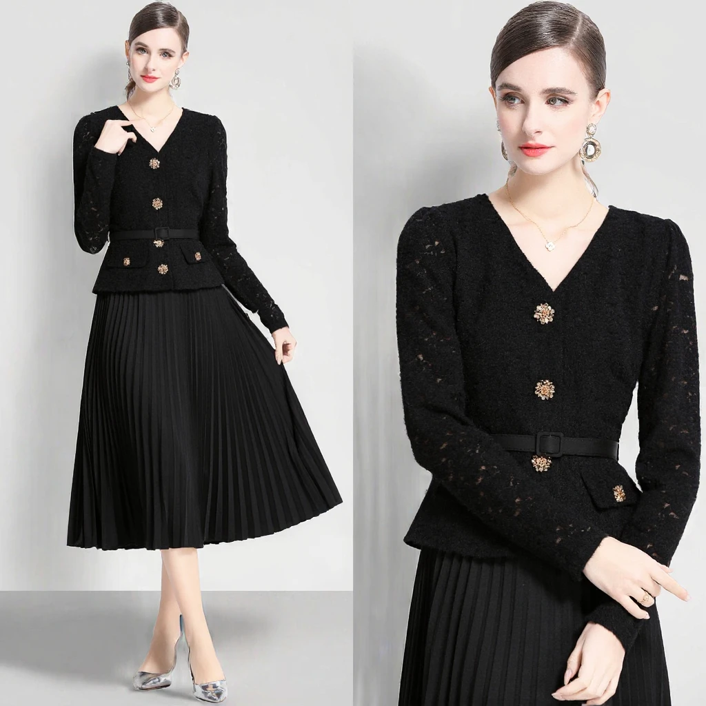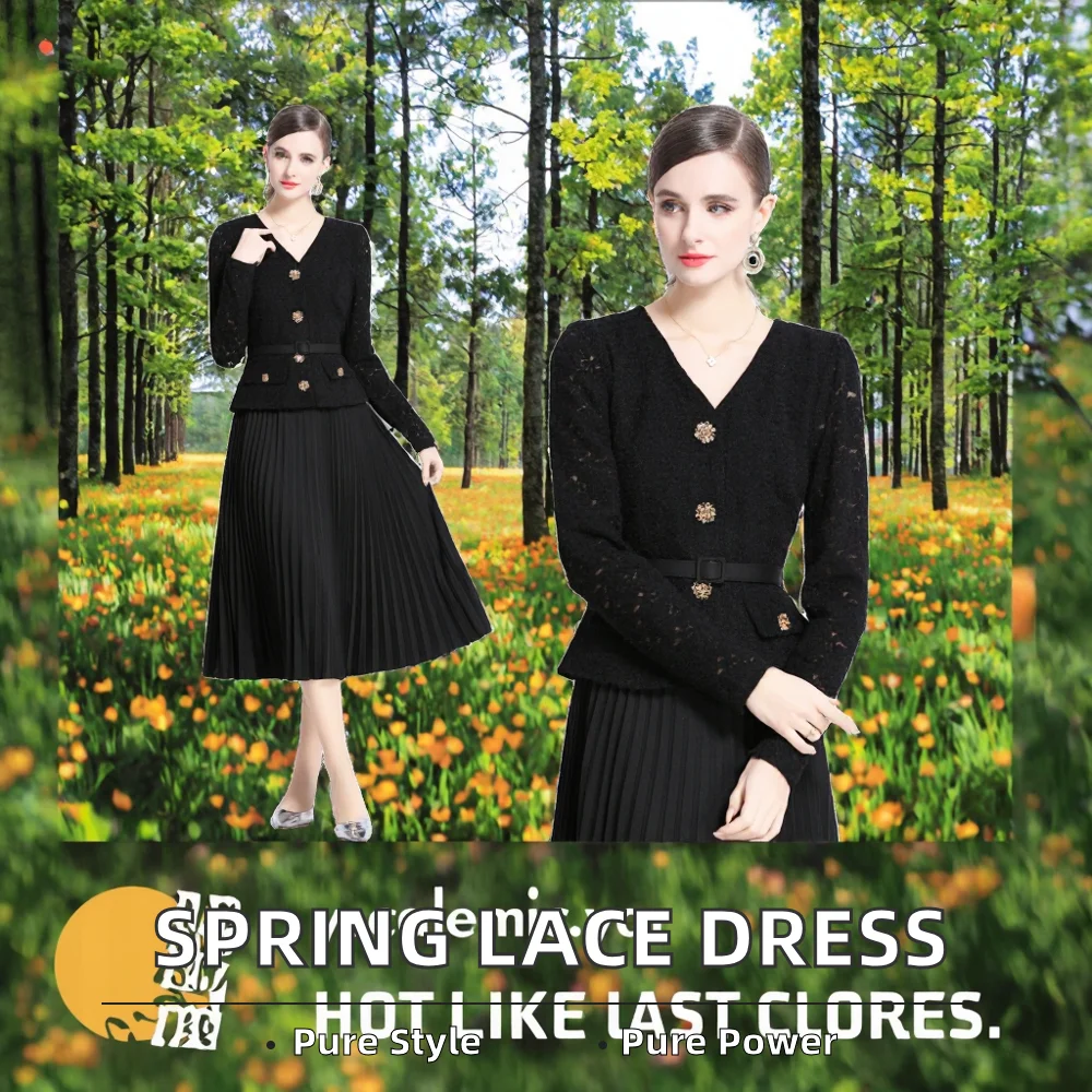 Customize Elegant Solid Pattern Lace-up Dress Slim Fit Pleated Empire Waistline Autumn Washable Boutique Clothing Wholesale