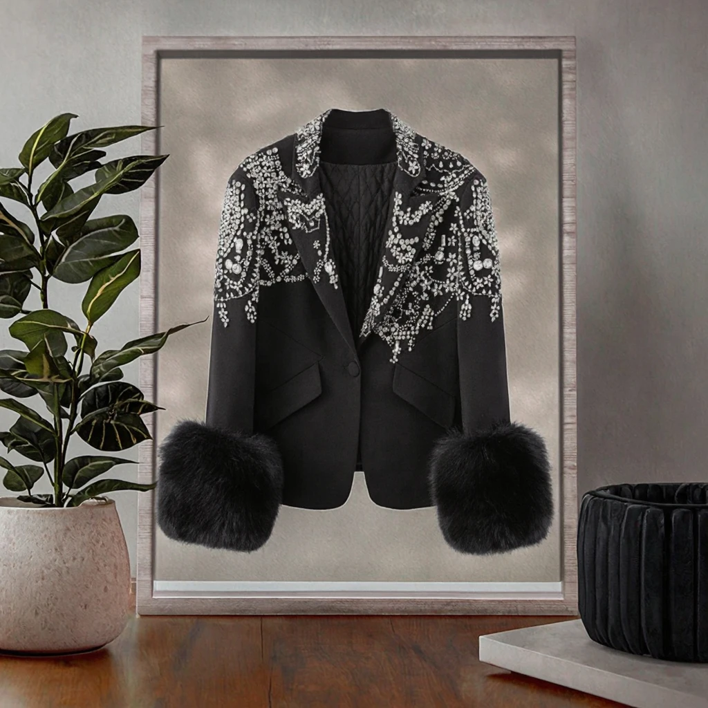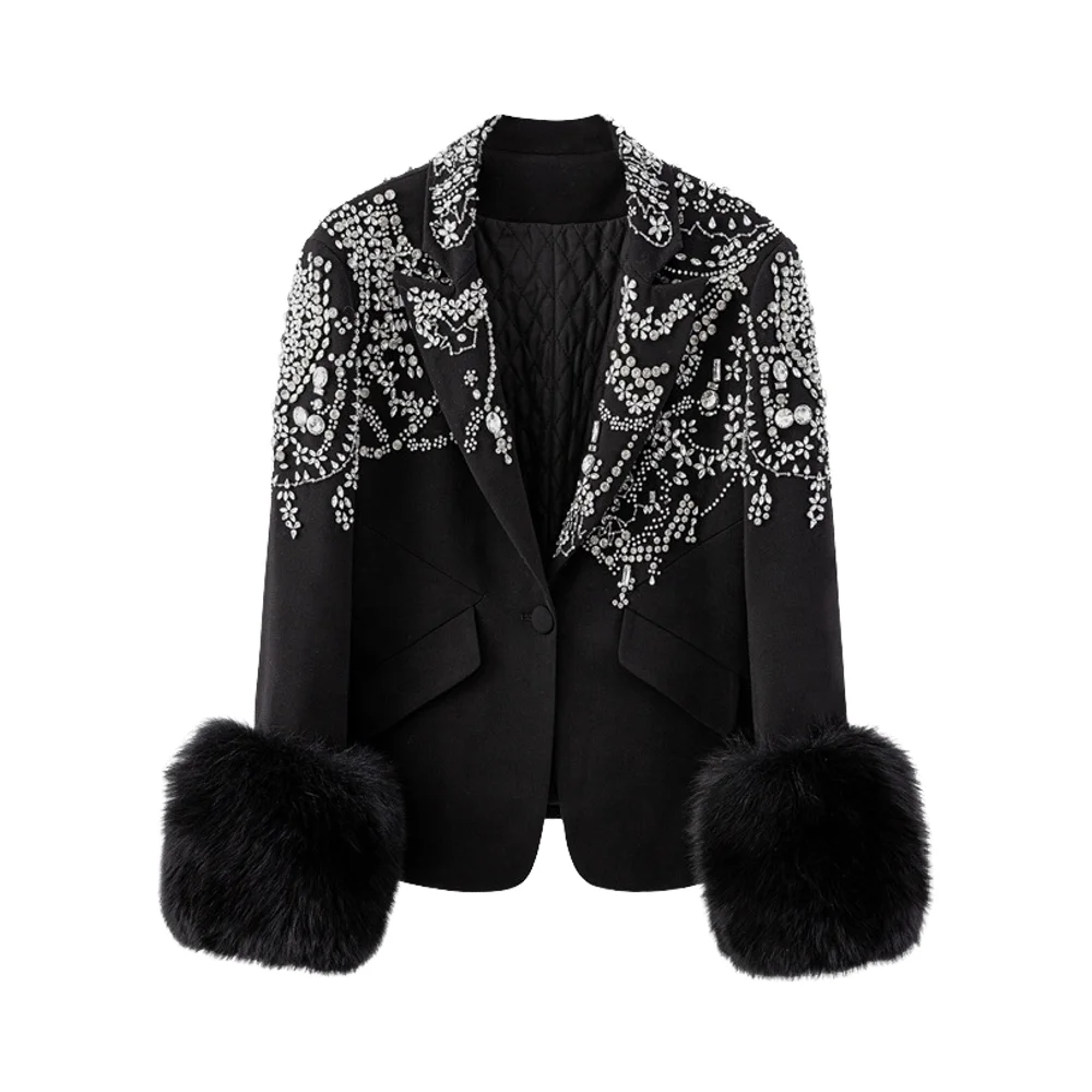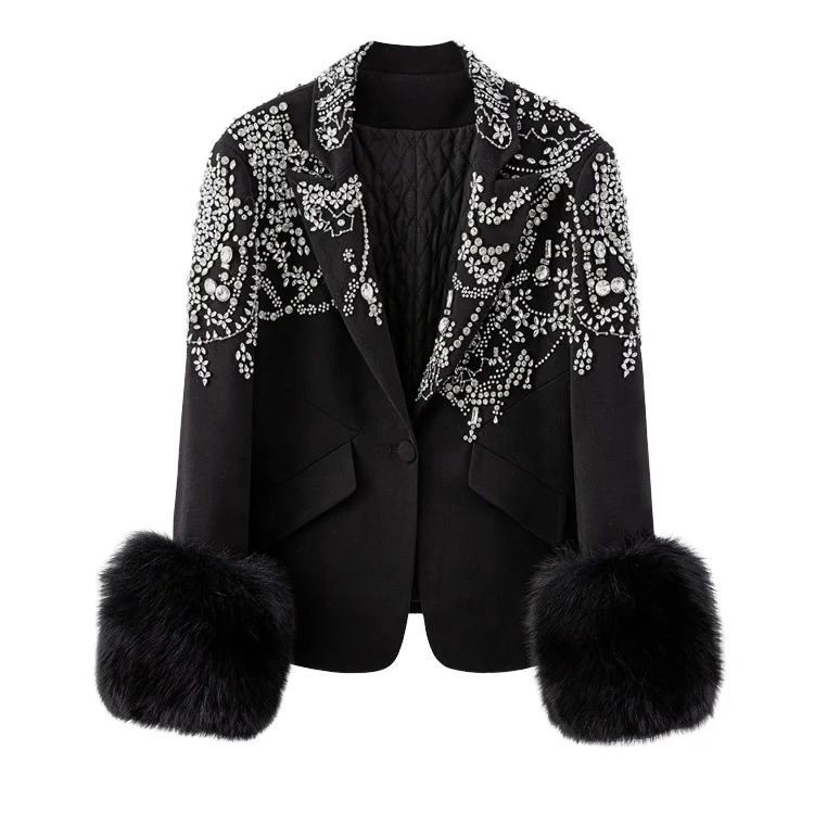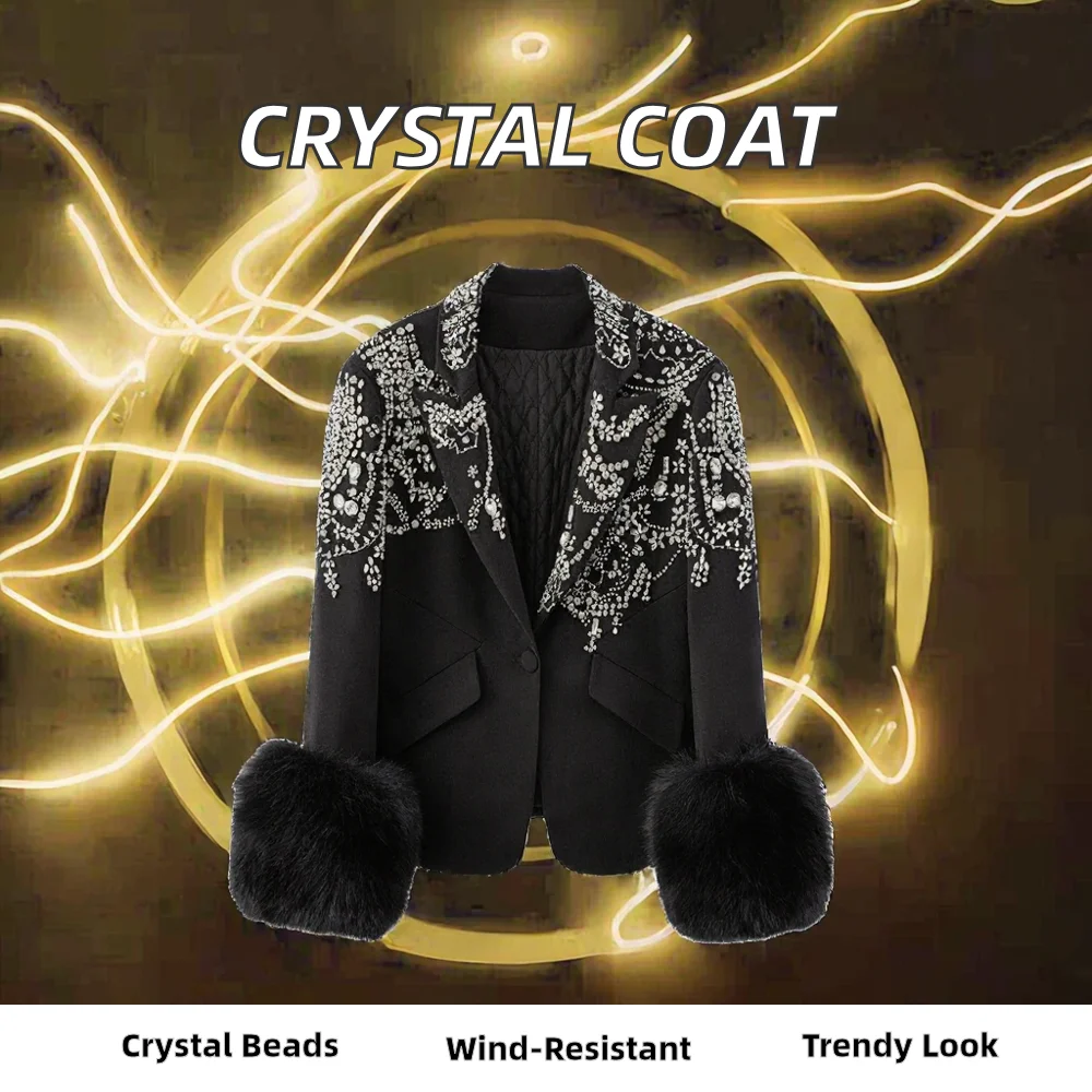 Customize New Dropshipping Wholesale High Quality Women's Fashion Single Button Solid Windproof Long Padded Crystal Beading Coat