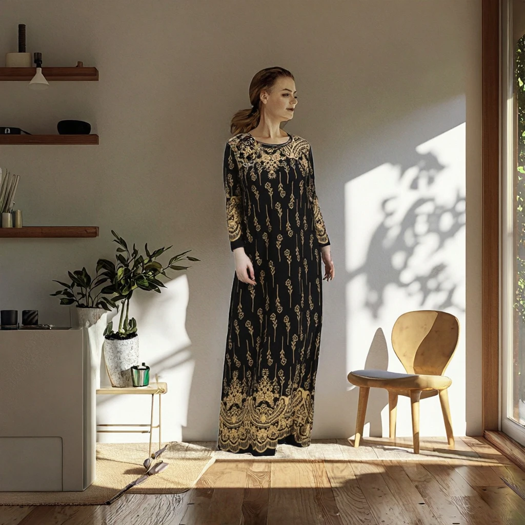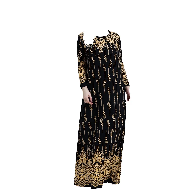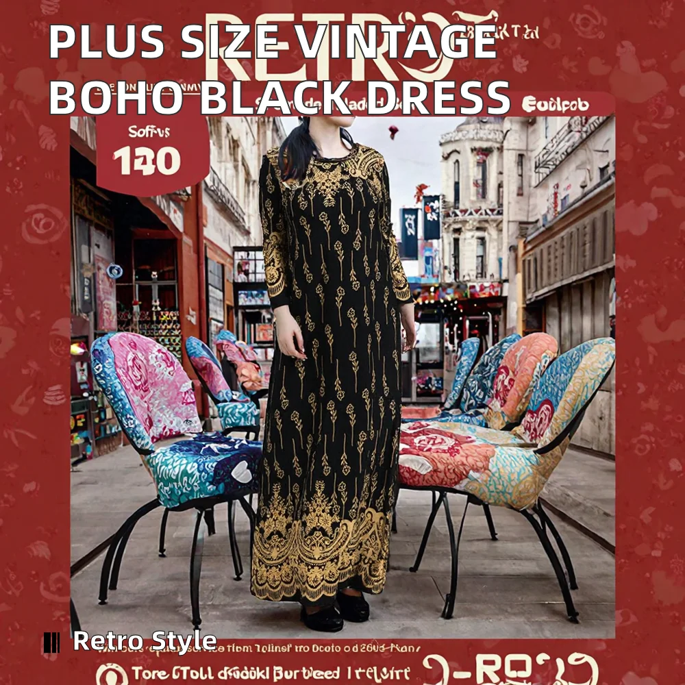 Customize Plus Size Loose Natural Women Print O Neck Long Sleeve Autumn Black Fashion Casual Custom Smock Vintage Boho Dress