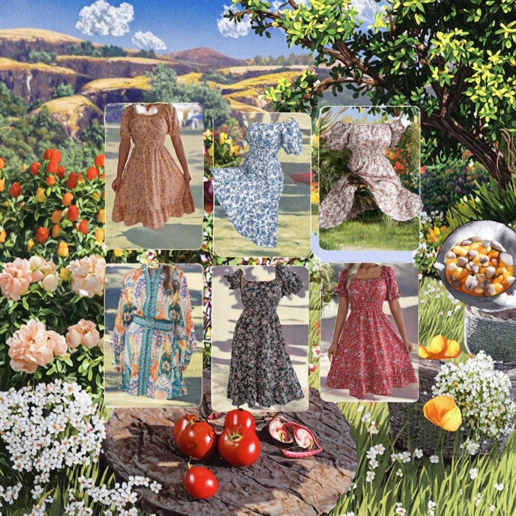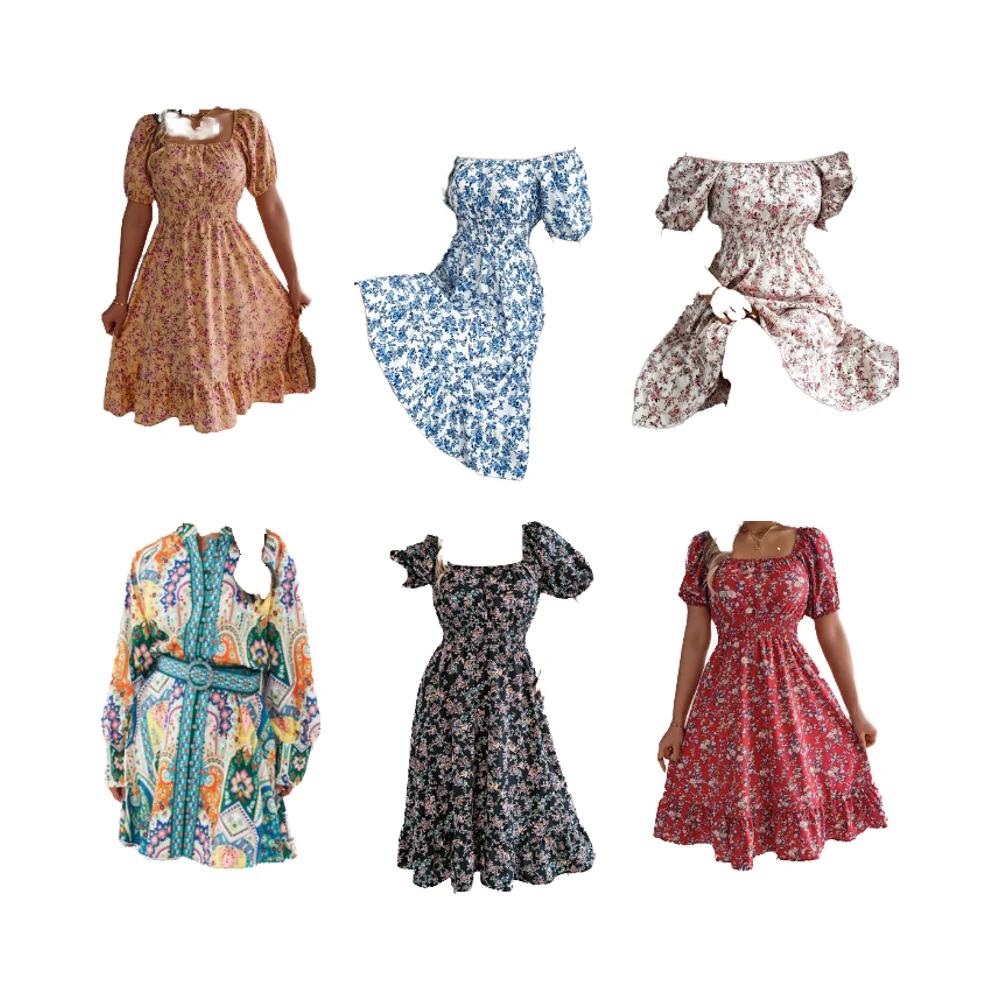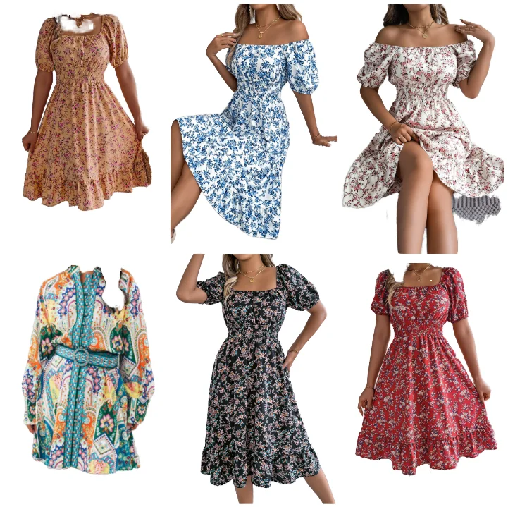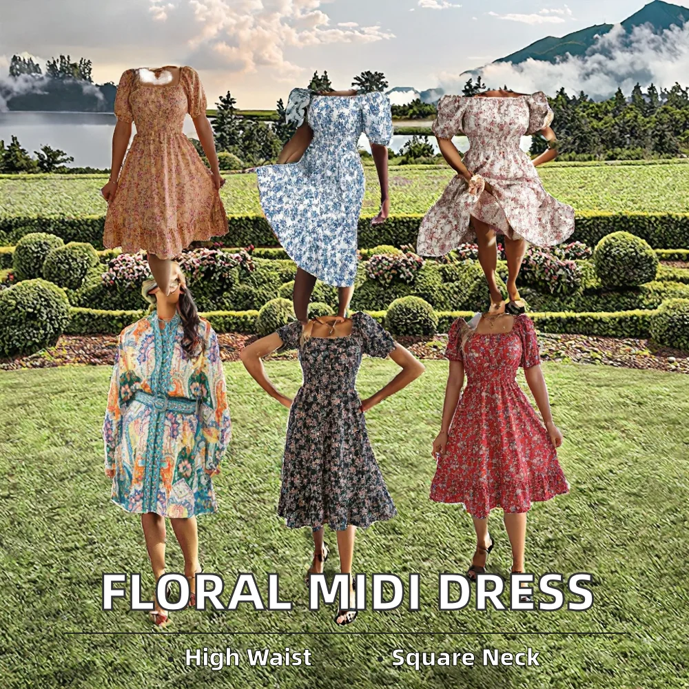 Customize Elegant Custom Floral Print Midi Dress Short Puff Sleeve Square Neck Shirred Detail Casual Style Summer Autumn Front