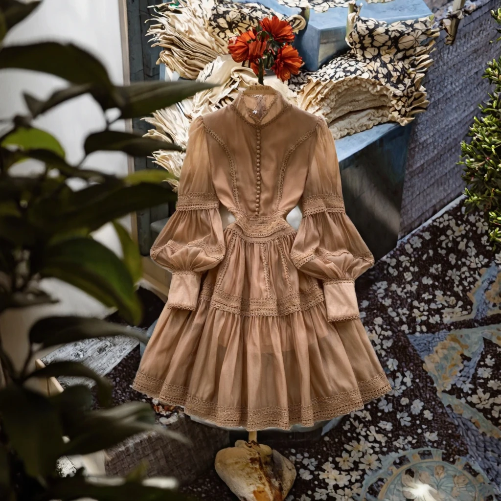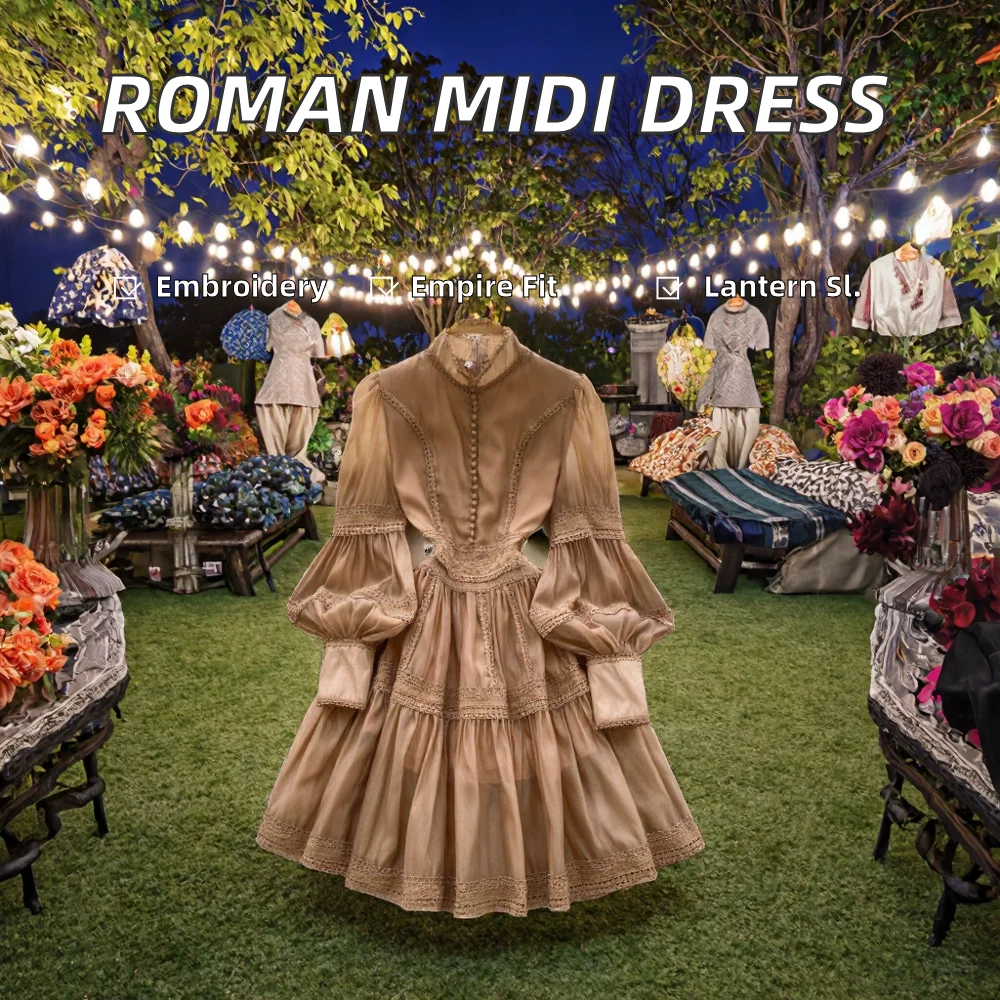Dark Green Spring Roman Casual Woven Breathable Eco-Friendly Midi Dress for Women Lantern Sleeve Empire Embroidery Lace