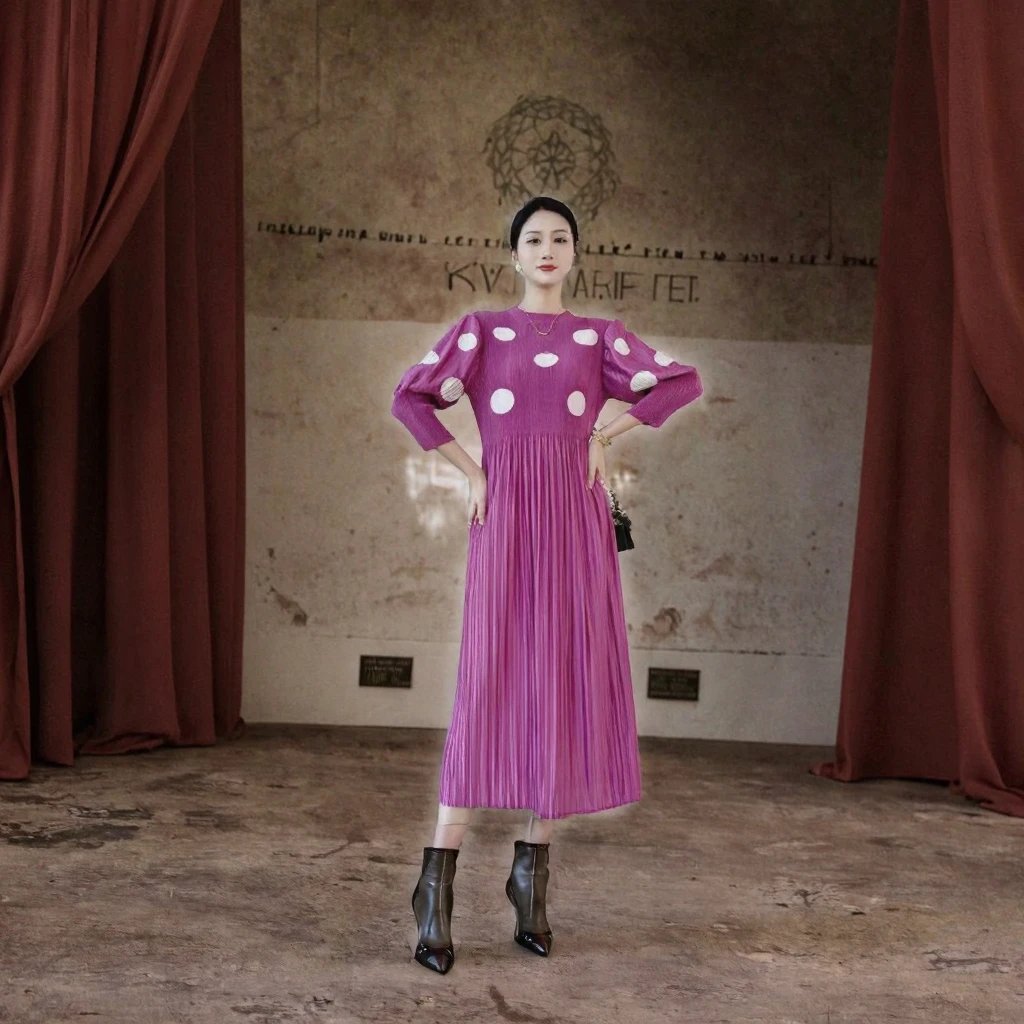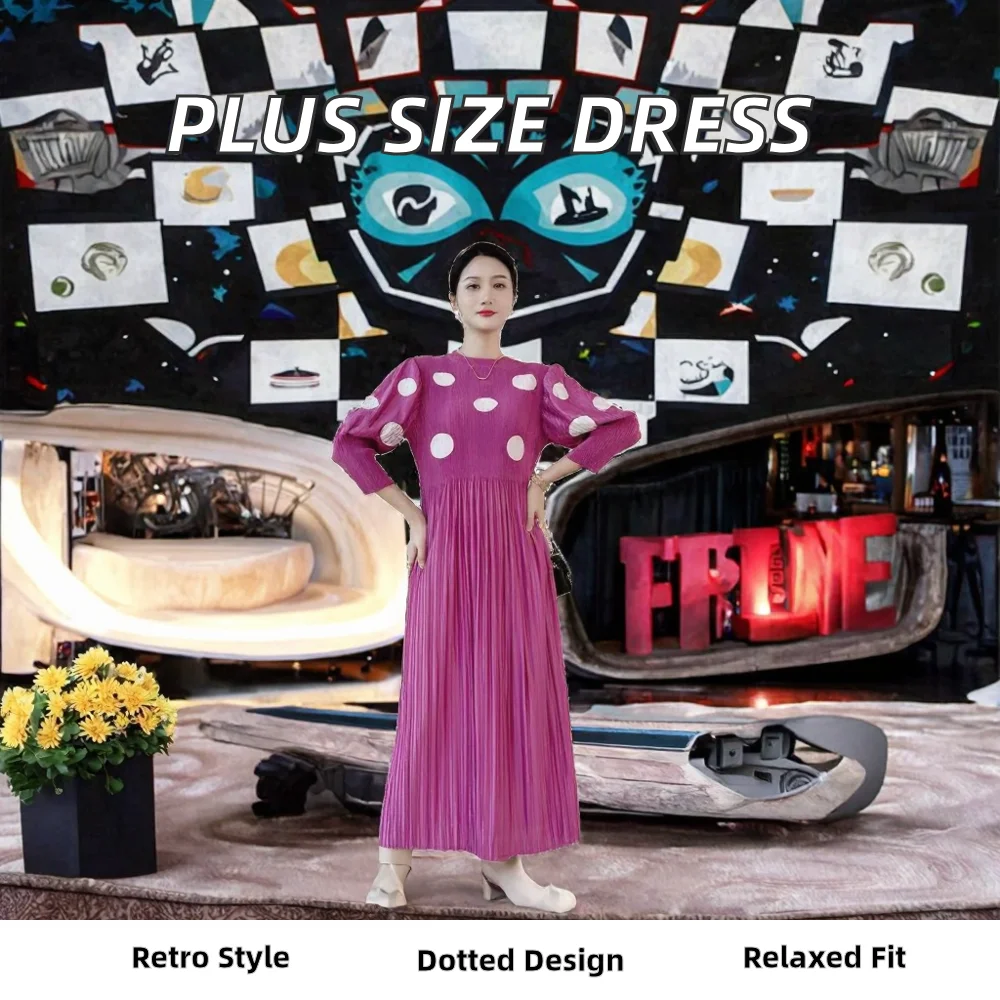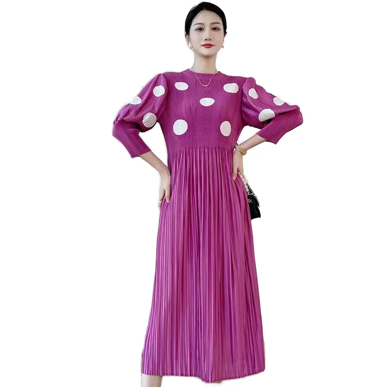 Customize Elegant Plus Size Floor-Length Dresses New Miyake Pleated Fall 3/4 Sleeve Polka Dots Tie Loose Vintage Swing Dress