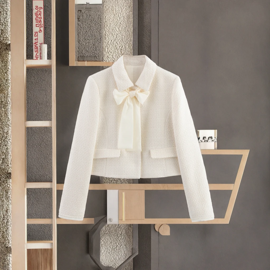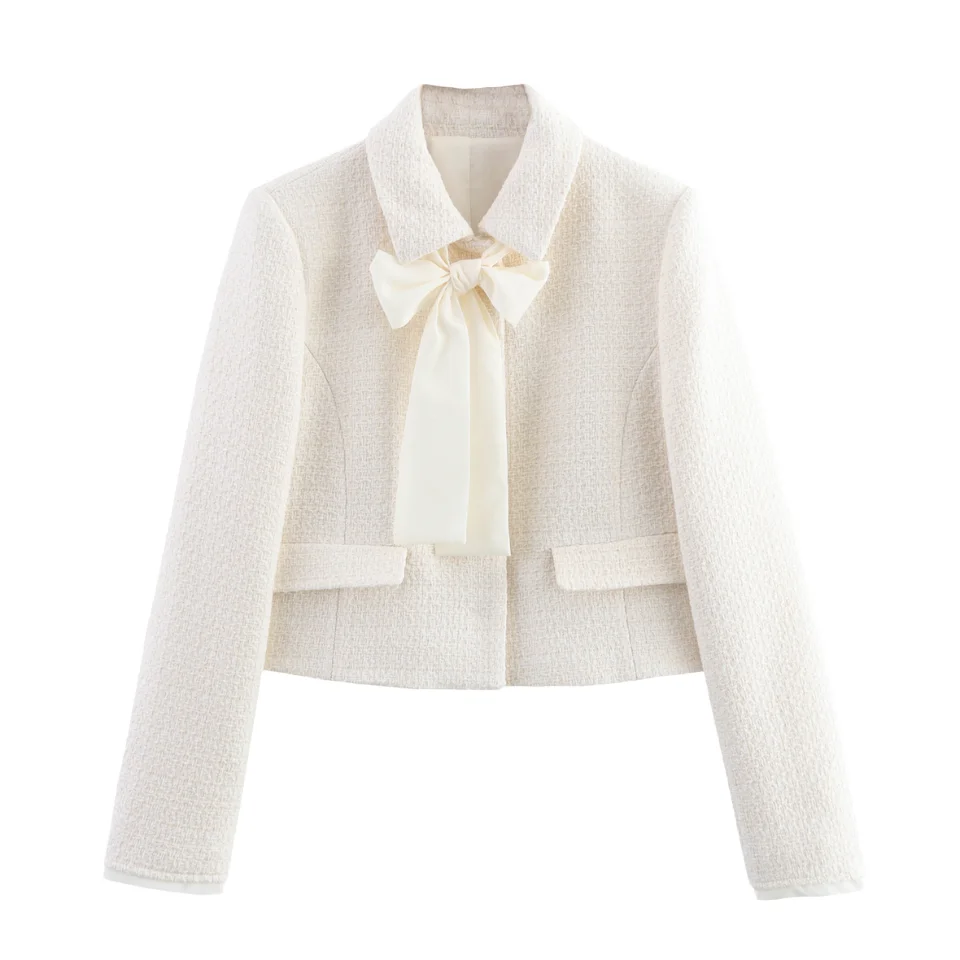 Customize Beige Casual Fashion Blazer Jacket Long Sleeve Turn Collar Bow Tie Single Breasted Solid Pattern Woven Button