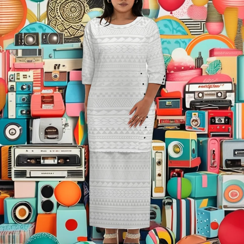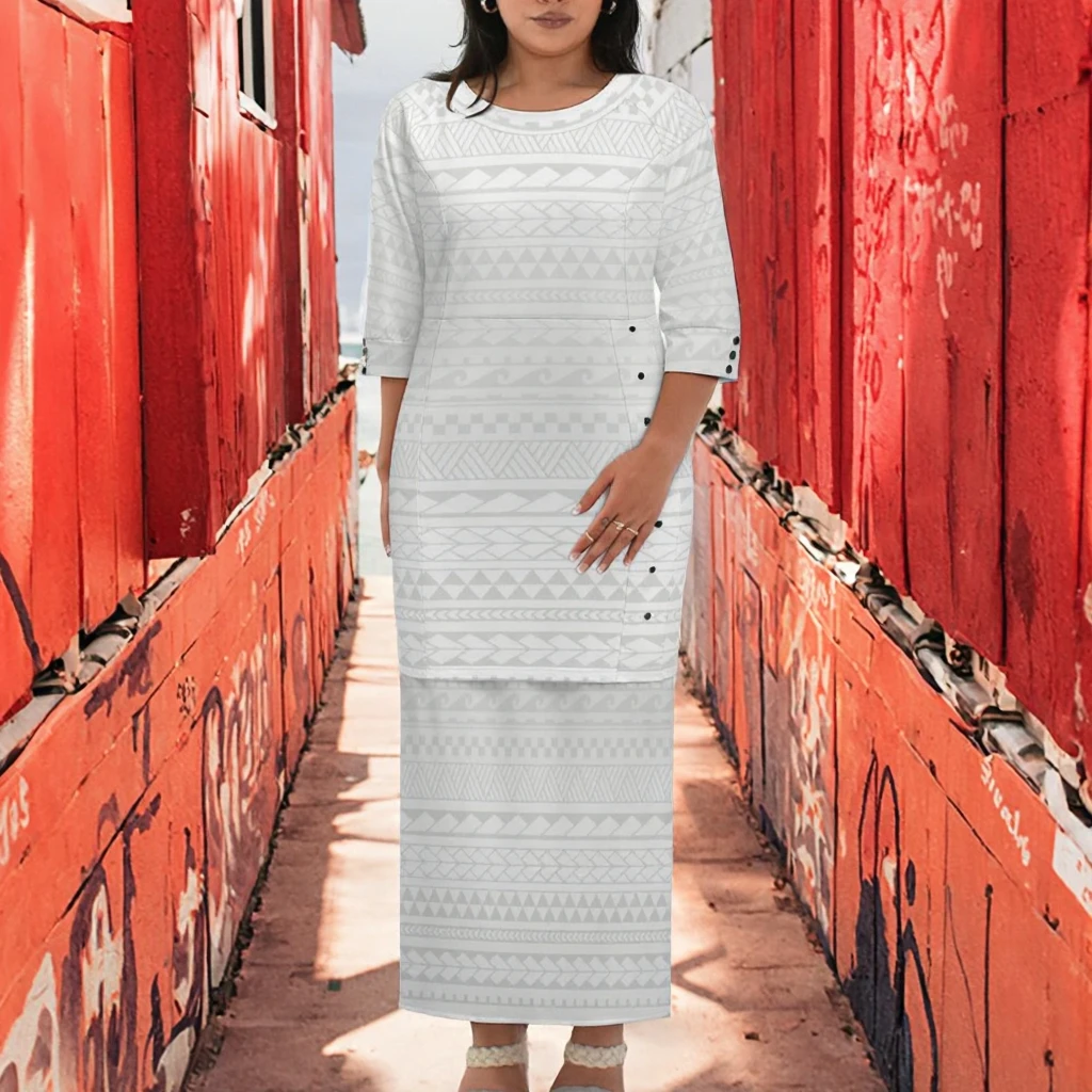 Customize Luxury Design Polynesian Tribal Print Vintage 2 Piece Women's Samoan Puletasi Dress White Natural Drop Shipping