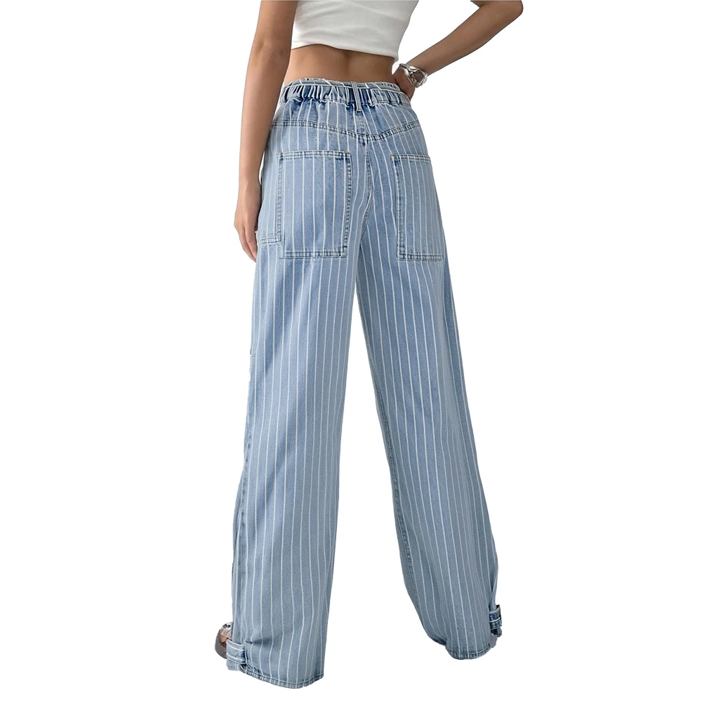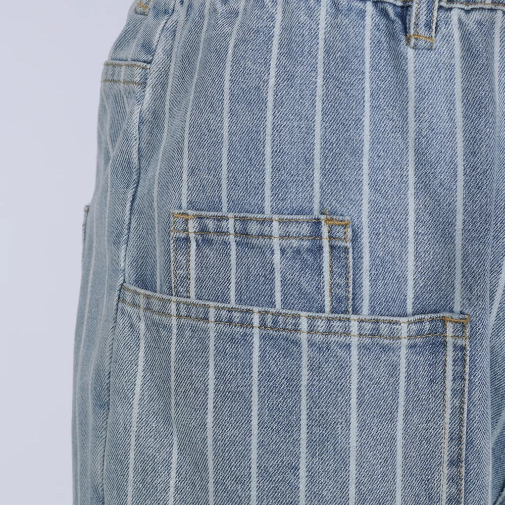 Custom Women Light Blue Striped Wide Leg Calcas Jeans Femininas Boyfriend Jeans Drawstring Waist Baggy Denim Casual Pant
