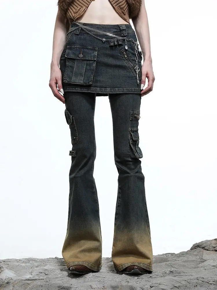 Custom Retro High Waist Patchwork Layered Skirt Jeans Pant Ensemble Jean Pour Femme Women Washed Vintage Women's Jeans Pants