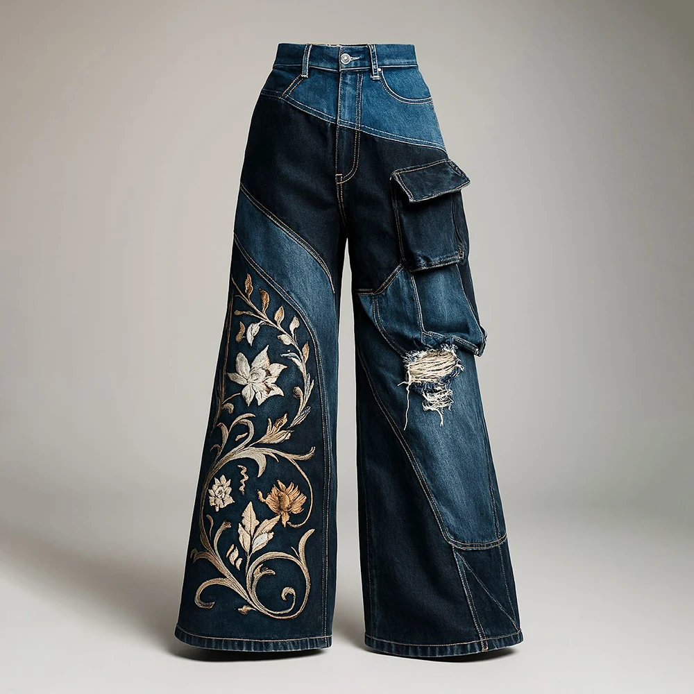 Custom Vintage Pattern 3d Embroidery Y2k Women's Casual Streetwear Denim Jeans Pant High Waist Ladies Loose Fit Jeans Trousers