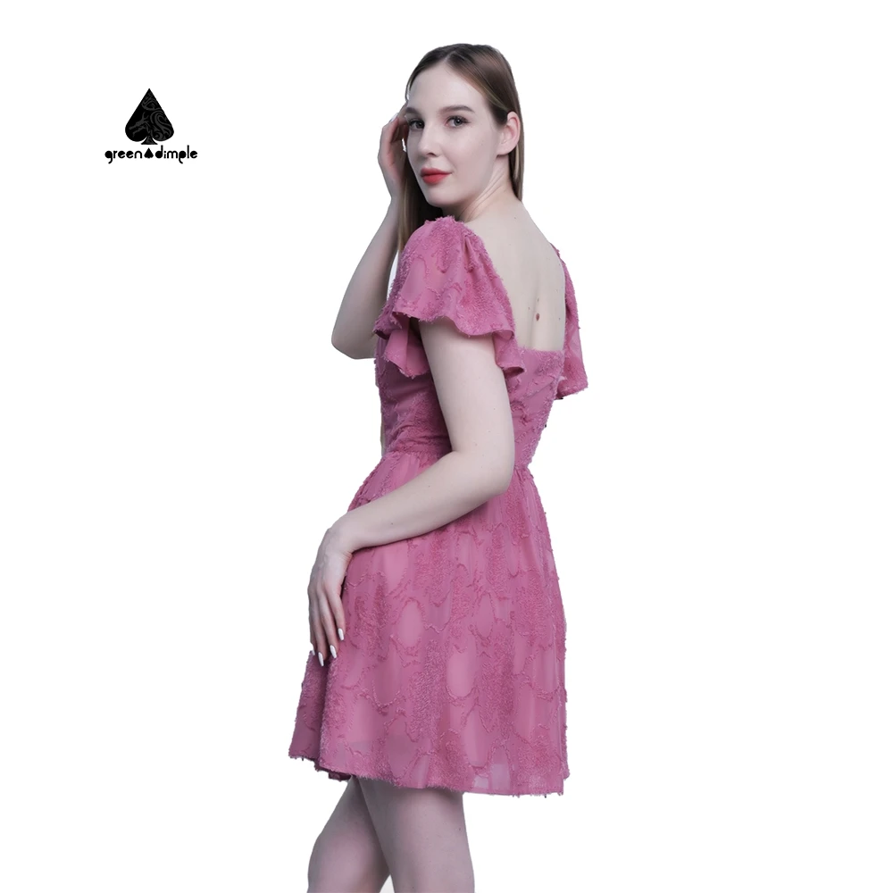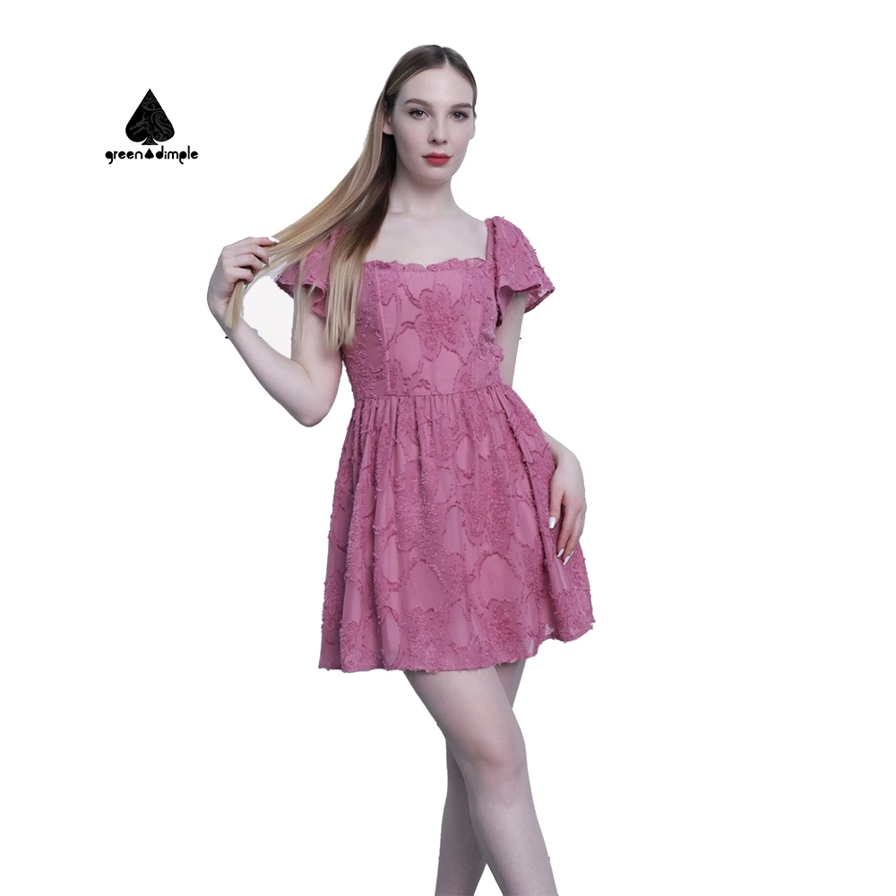 Custom Ladies Casual Empire Waist Modest Dress High Quality Floral Jacquard Pattern Embroidery Lace Burgundy Dress Short