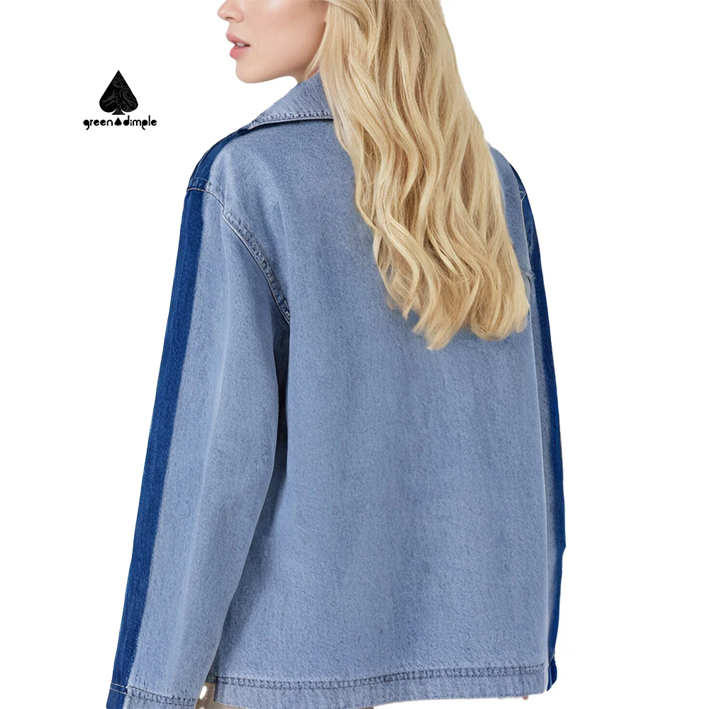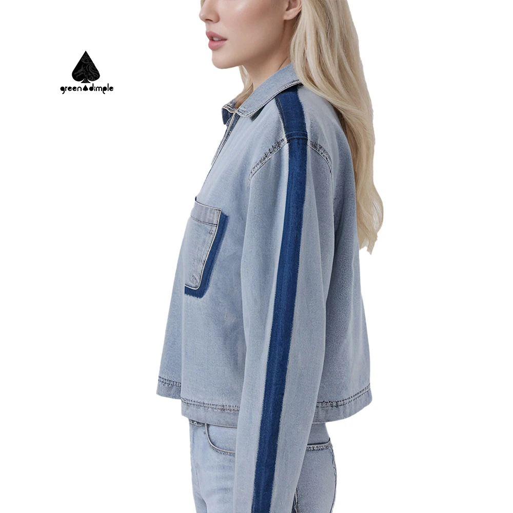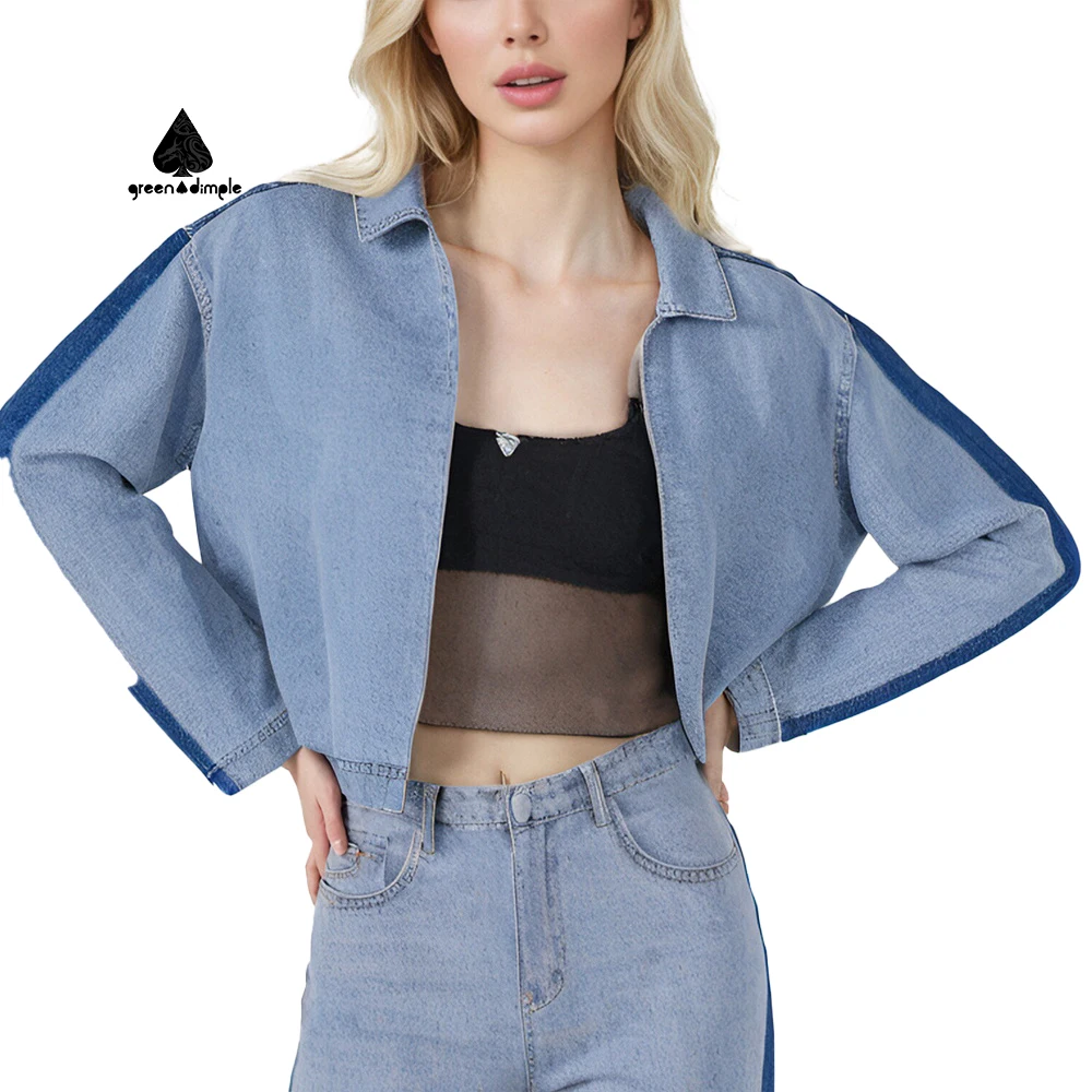 Women Light Blue Cropped Denim Jacket Collared Neck Contrast Trim Long Sleeve Casual Style Sewn Craft Daily Jacket