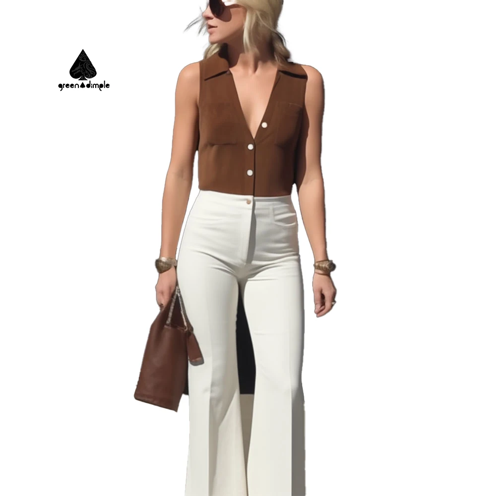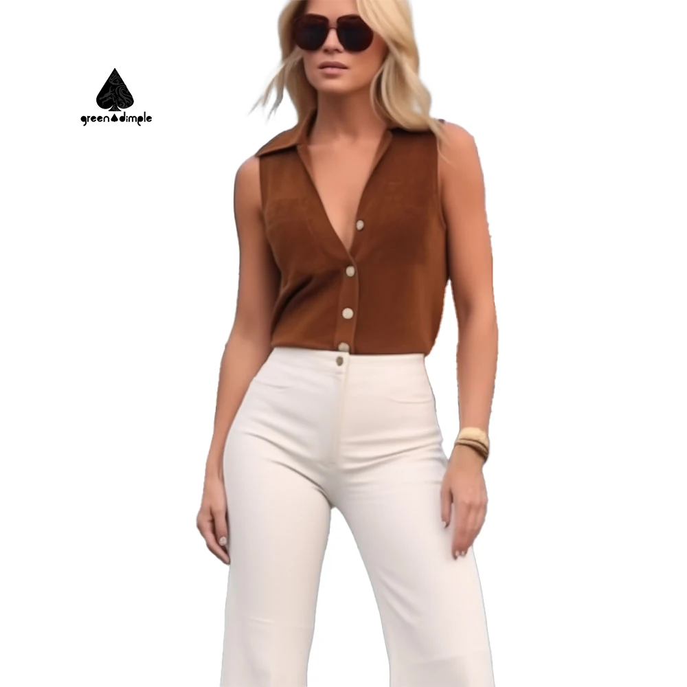 Lady Quality Customize Spring Summer New Solid Color Lapel Button Vest Chiffon Top for Casual Front Woman Shirt
