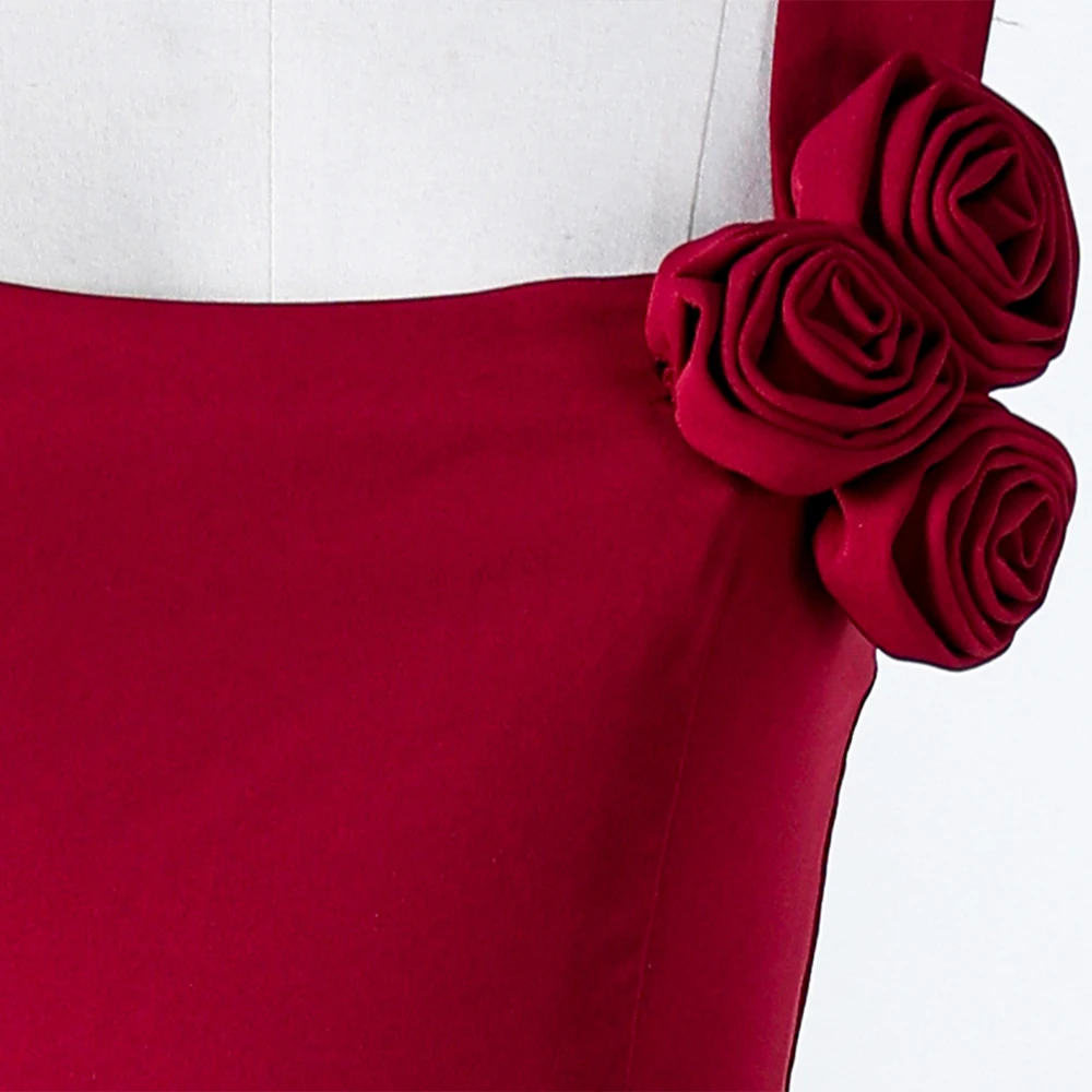 Red Square Neck Maxi Dress Women Casual Long Sleeve Side Slit Design Flower Decoration Slim Fit Elegant Daily Party Wear Dress