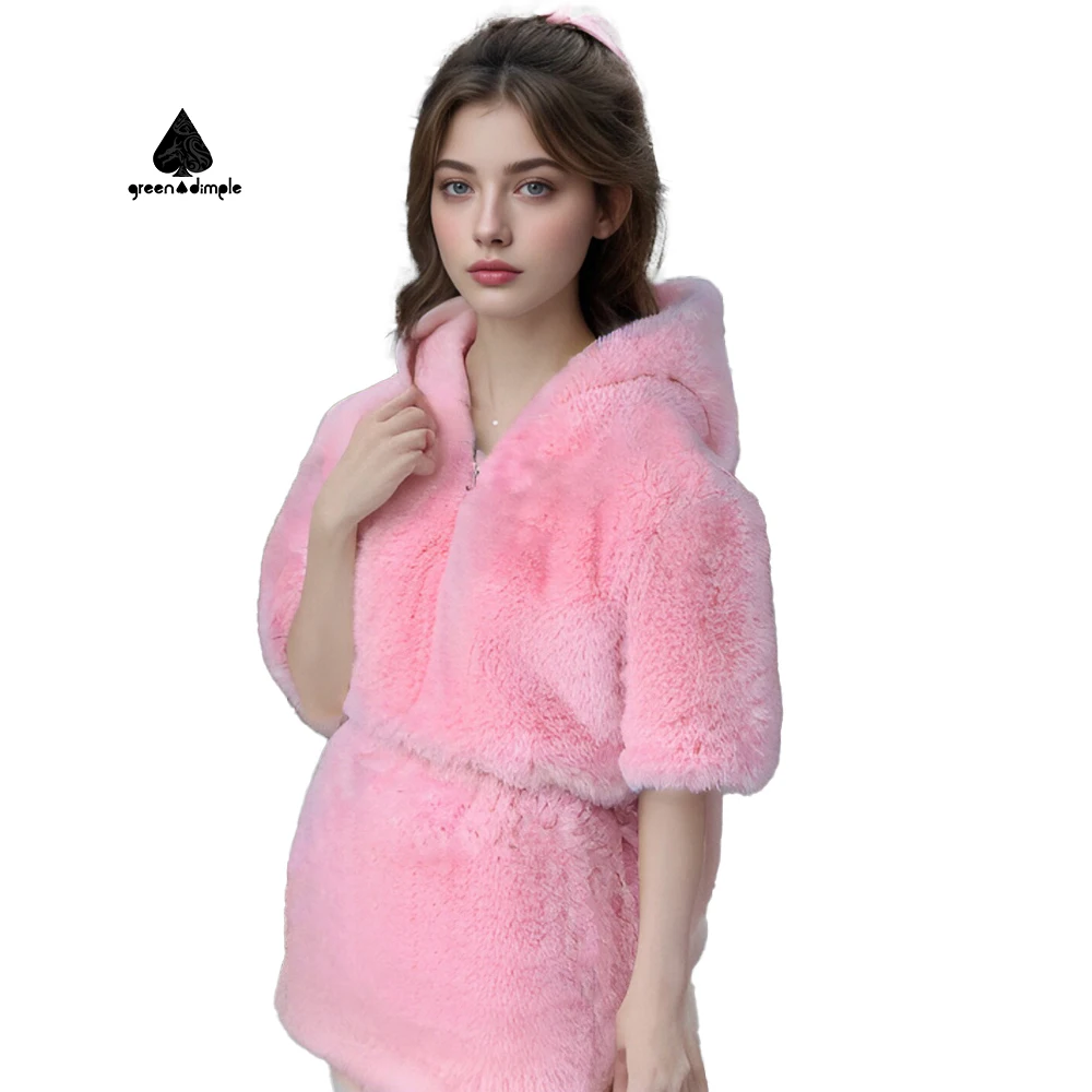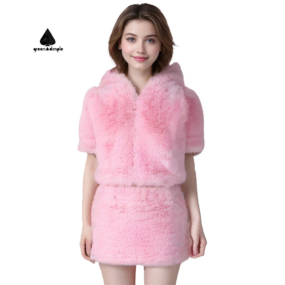 Original Clothing Manufacturers Custom Women Winter pink Fashion Flannel Hooded Jacket and Short Skirt 2 Pieces Set