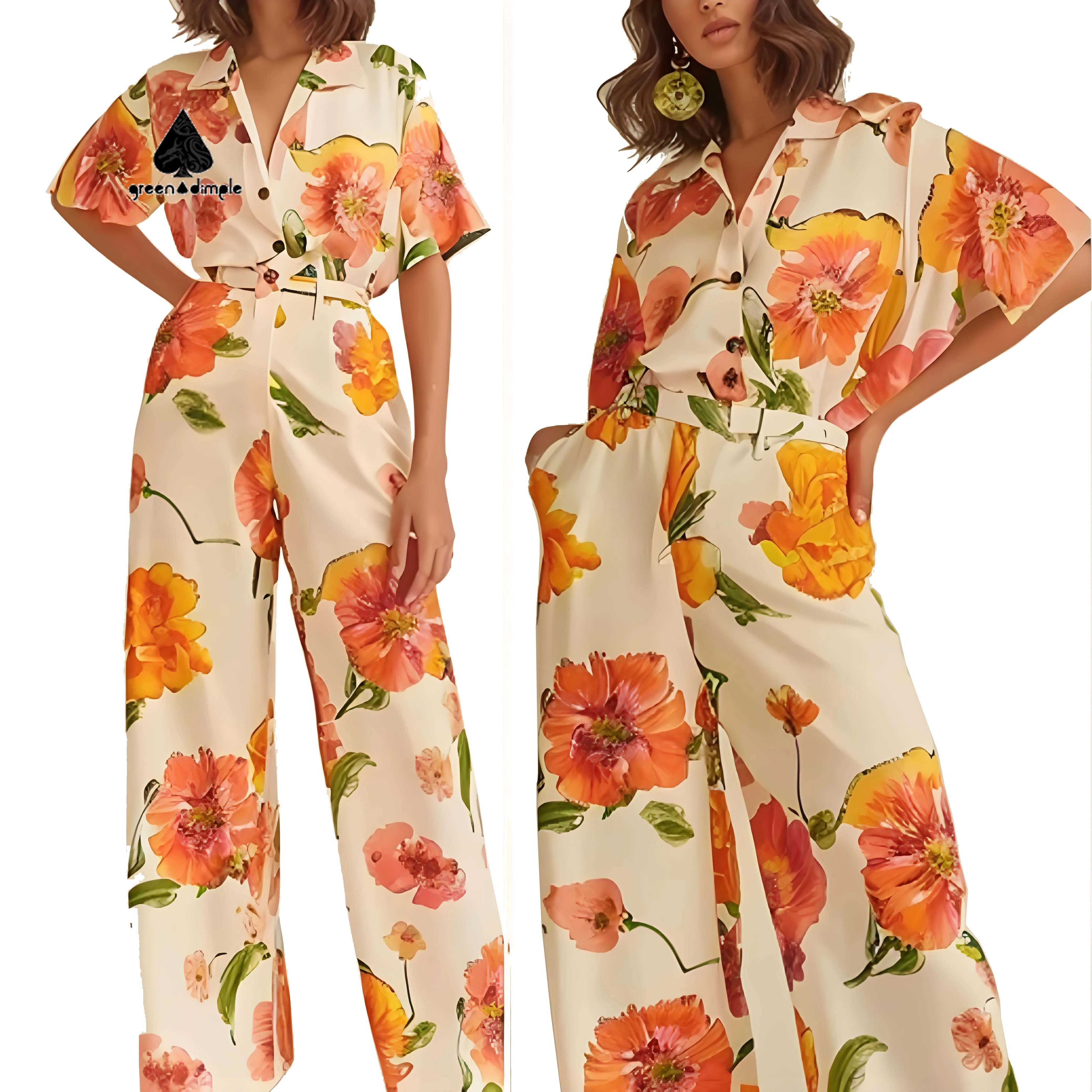 Women Orange Floral Print Loose Style Jumpsuit Short Sleeve Button Front Wide Leg Woven Hawaii Style Printed Casual Jumpsuit