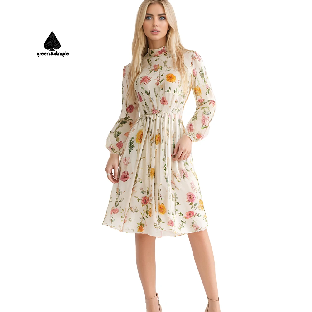 Women Cream Floral Print High Neck Midi Dress Long Sleeves Elastic Waist High Quality Vintage Sweet Casual Dress