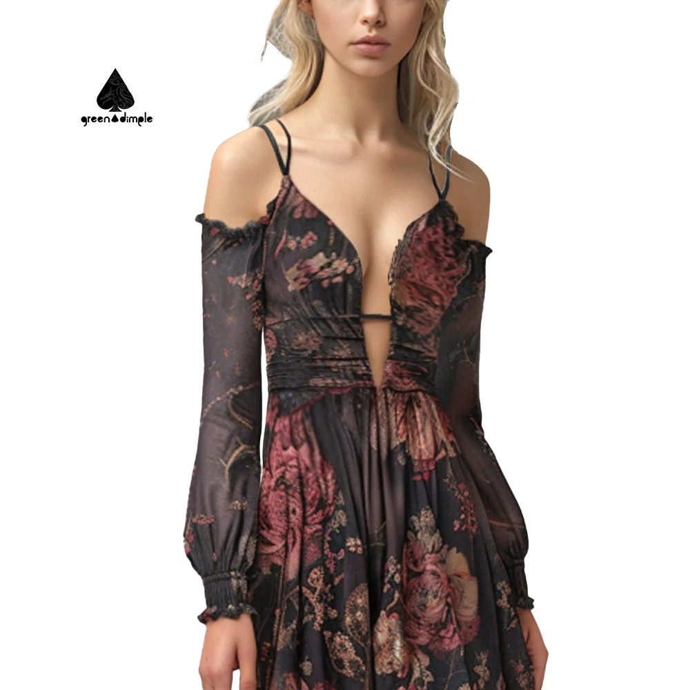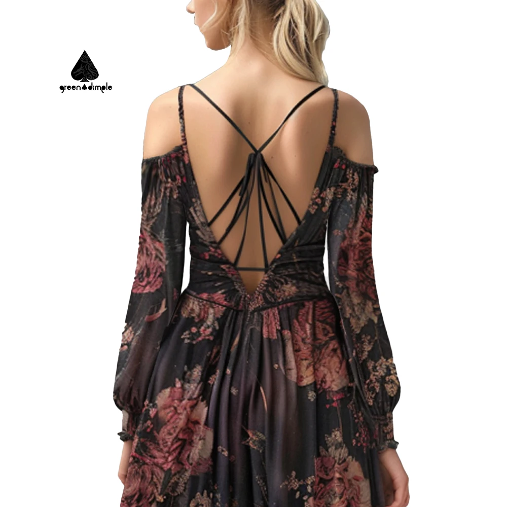 Custom Dress Manufacturer Vintage Women Elegant V-neck Hollow Out Floral Dress Lace up Fancy Ladies Casual Party Dress