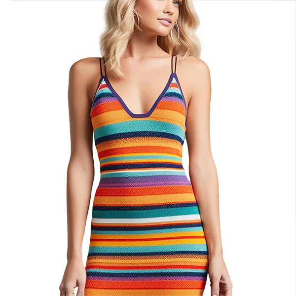 Custom Manufacturer Backless Ladies Summer Casual Knitted Dress Slim Elastic Bodycon Multicolor Striped Women Dress