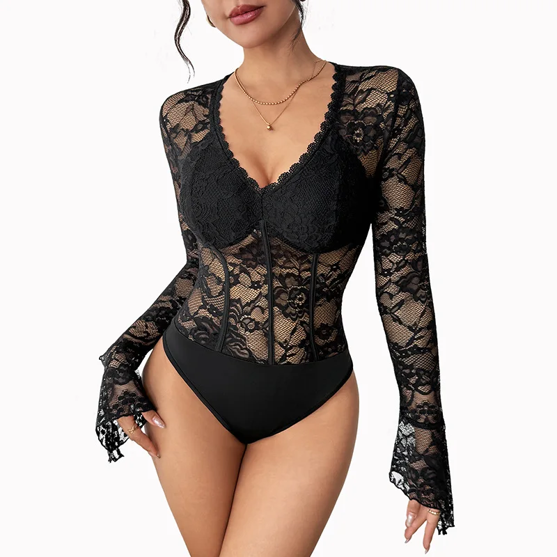 2026 New Style Thin and Sexy Patchwork Lace See-through Jumpsuit, Long-sleeved Slit V-neck Black Jumpsuit for Women