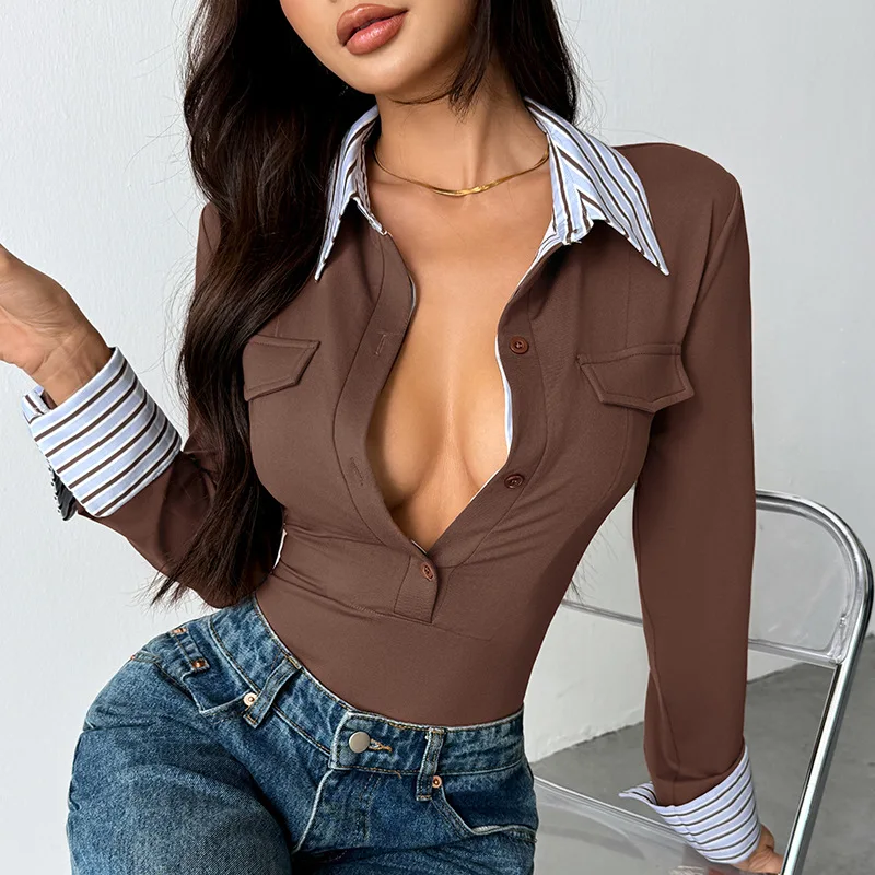 2026 New commuter Sweet and Mature Style Faux Two-piece Striped Shirt Collar Long-sleeved Slim Jumpsuit for Ladies