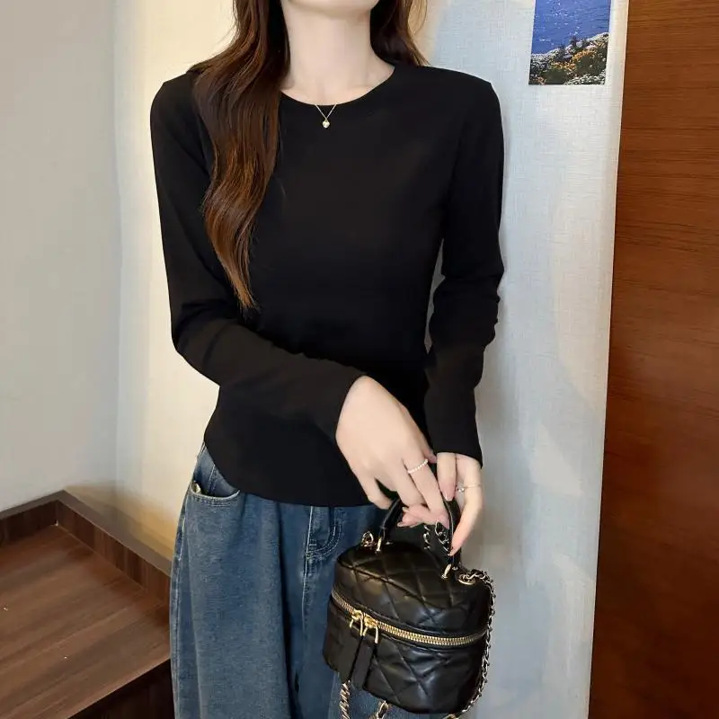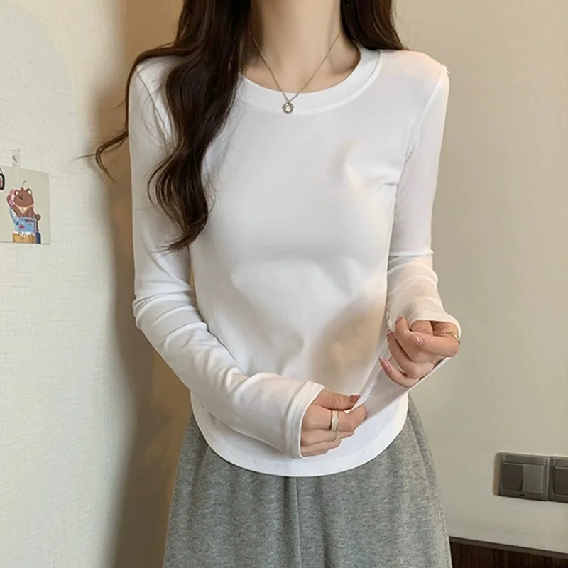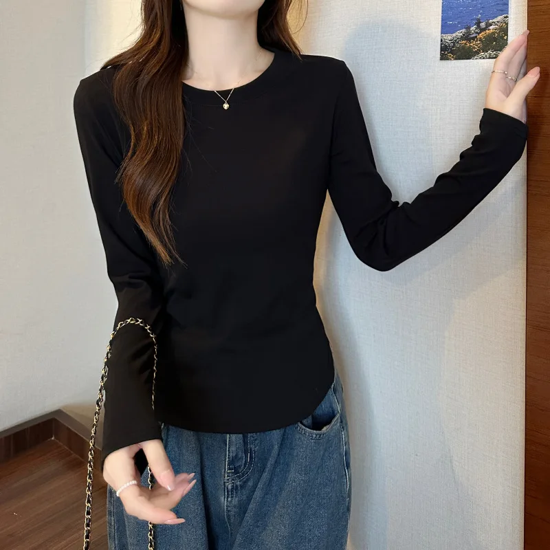 2026 Autumn New Women's Solid Color Print Cotton Spandex Long-Sleeved T-Shirt Flattering Figure Casual Outerwear Inner Wear