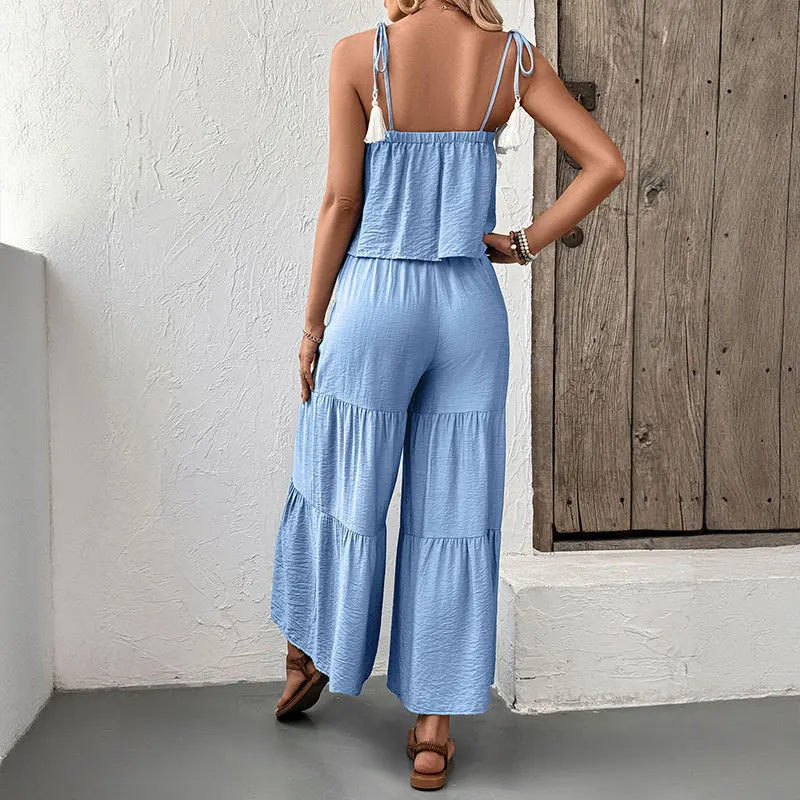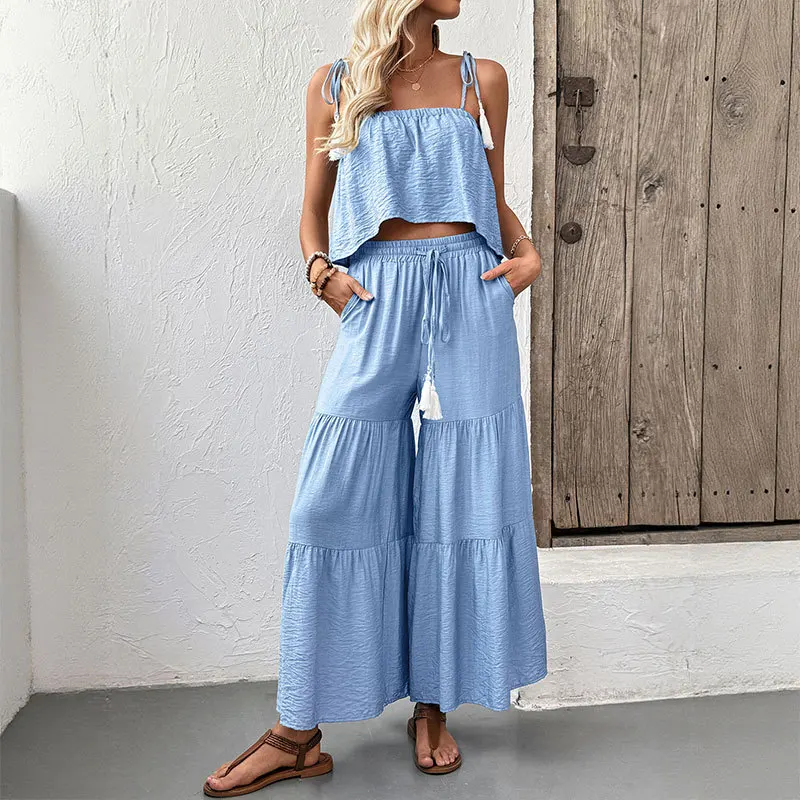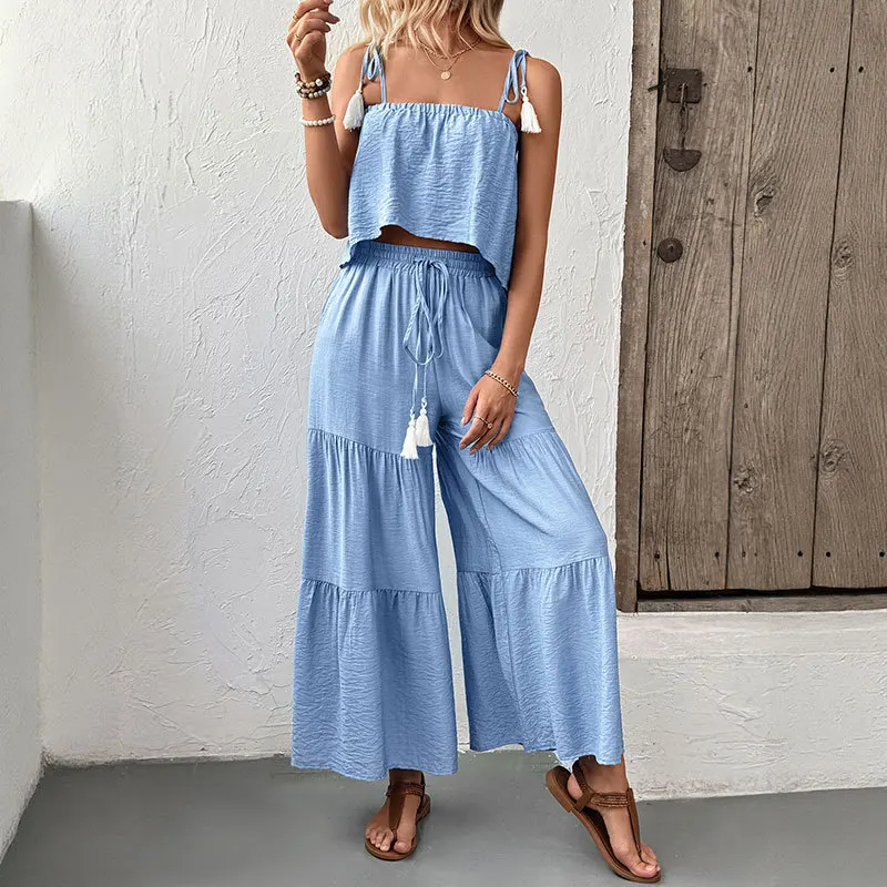 New casual strappy top, wide-leg trousers, solid-color set, two-piece summer vacation women's wear