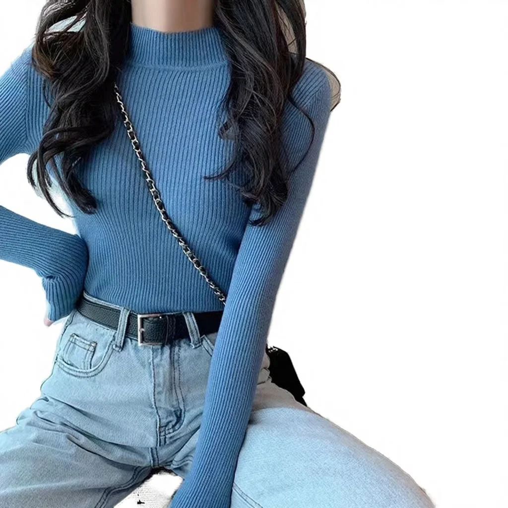A Long-sleeved Semi-high Neck Sweater with a Base Layer and a Semi-high Neck Pullover in a Solid Color for Women