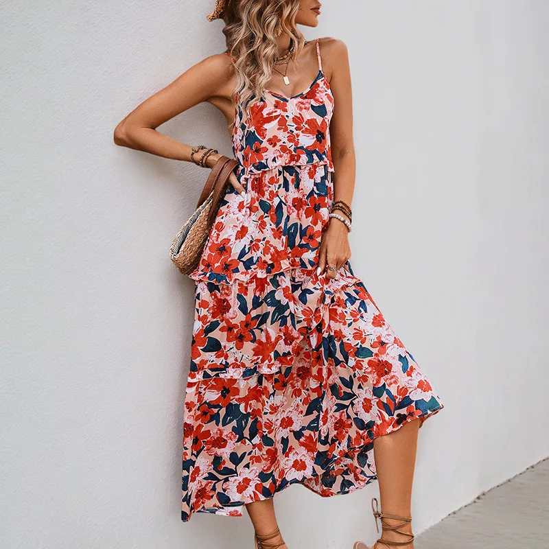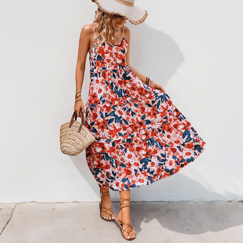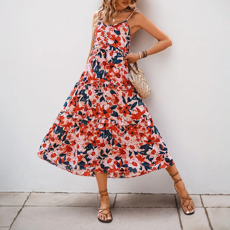 For Independent Station Foreign Trade 2025 New European American Summer Vintage High Waist Flounce Printed Midi Slip Skirt
