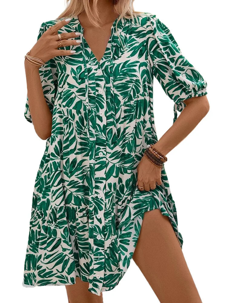 For European and American Summer Dress Cross-border Seaside Vacation Green Leaf Print Puff Sleeve Loose Doll Anti-Wrinkle