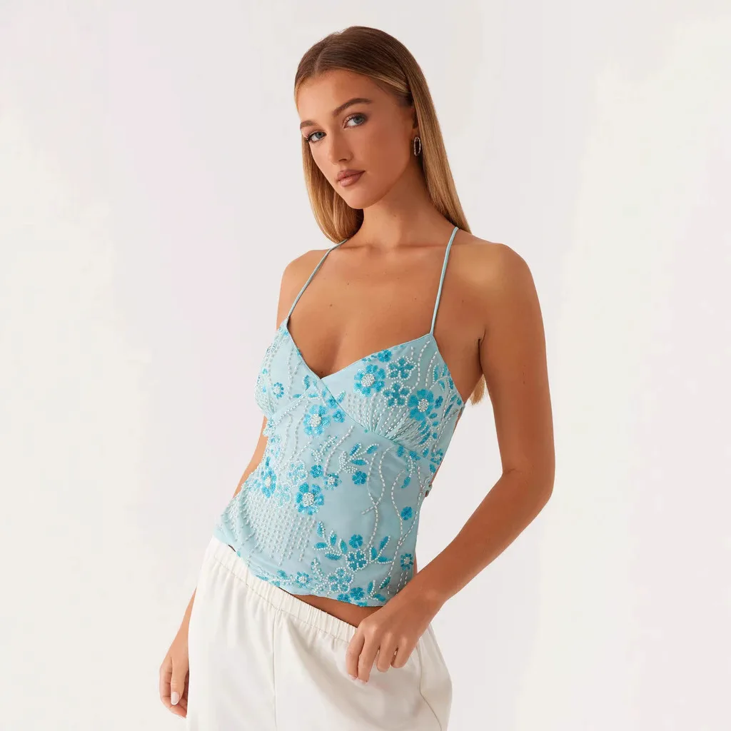 Summer New Women's Embroidered Sequined tank Top, Short and Sexy Spice Girl Halter Top for Women
