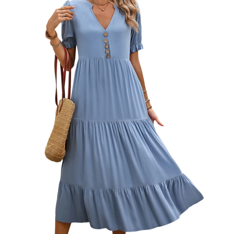 2025 Summer New European and American Short Sleeved Pleated Skirt Loose V-neck Long Skirt