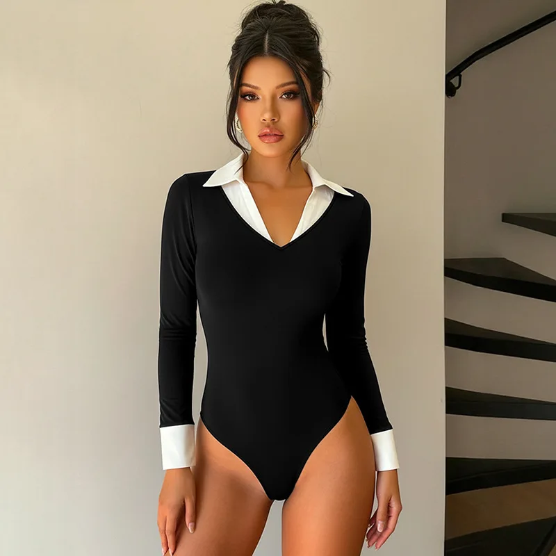2026 New Sexy and Spicy Girl Pure Desire Style Black and White Contrasting Color Lapel Patchwork Women's Long-sleeved Jumpsuit
