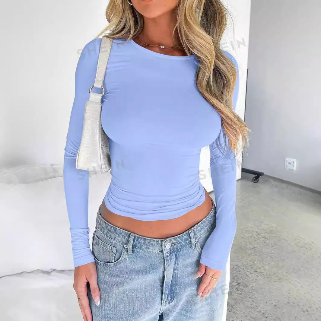 A Solid-color, Form-fitting, Round-neck, Short, Long-sleeved T-shirt for Women's Wear in the Autumn of 2026