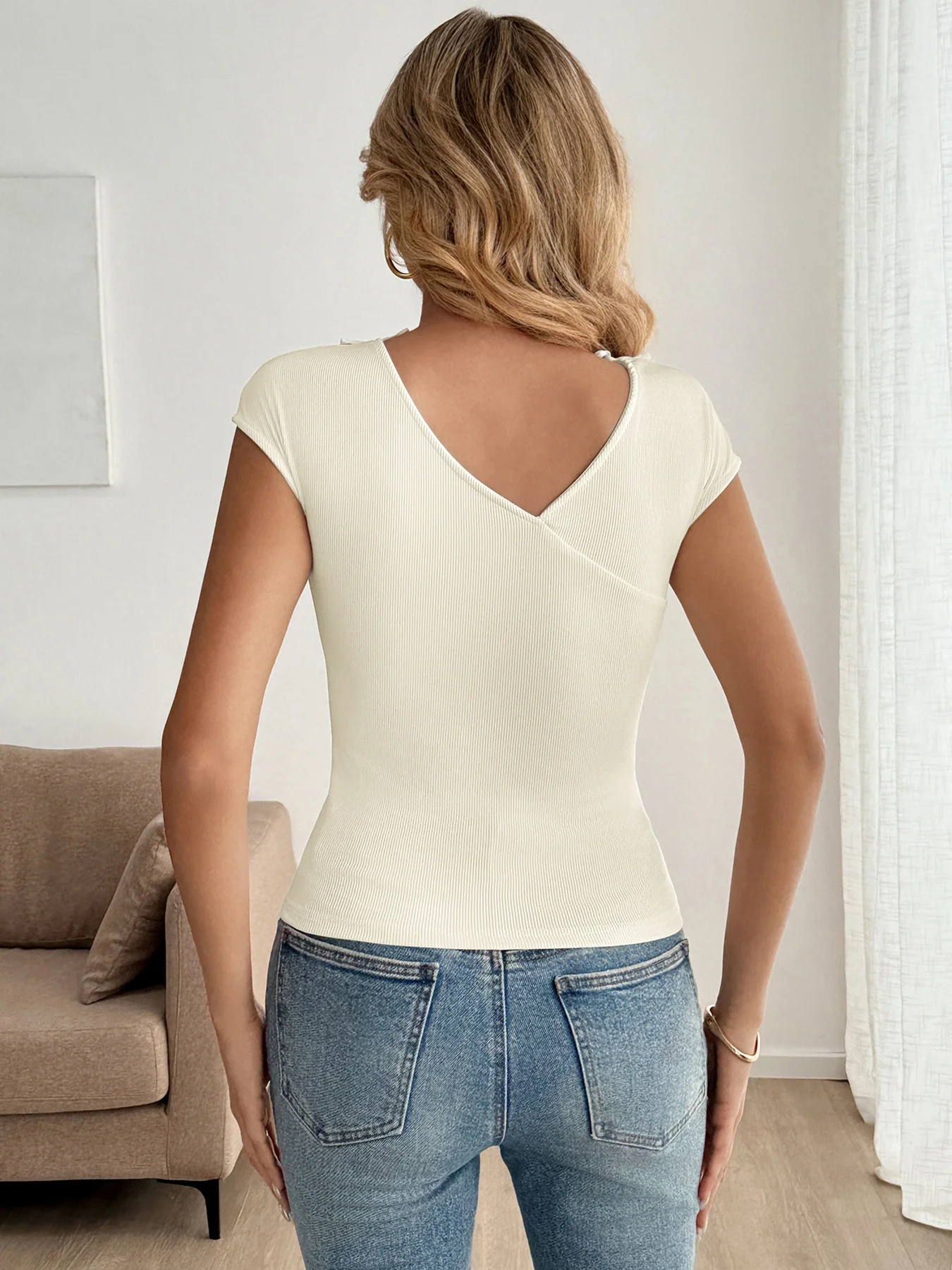 2026 TikTok Summer Hot Sale New Sweet V-neck Knitted Pullover T-shirt Slim Solid Color High-grade Women's Top with Bow