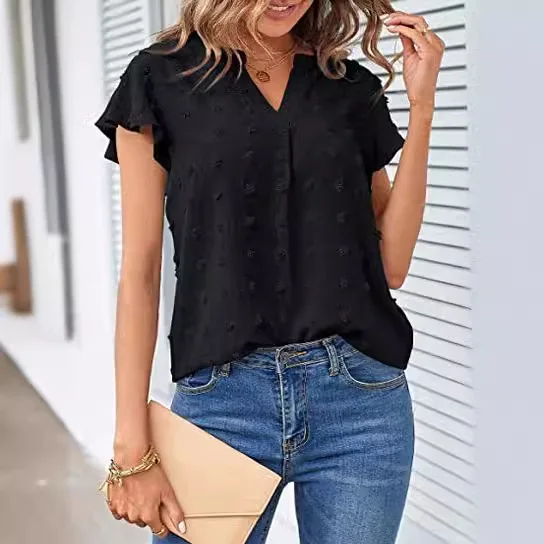 Summer new pleated ruffled sleeve top for women, commuter style V-neck short-sleeved white shirt for ladies