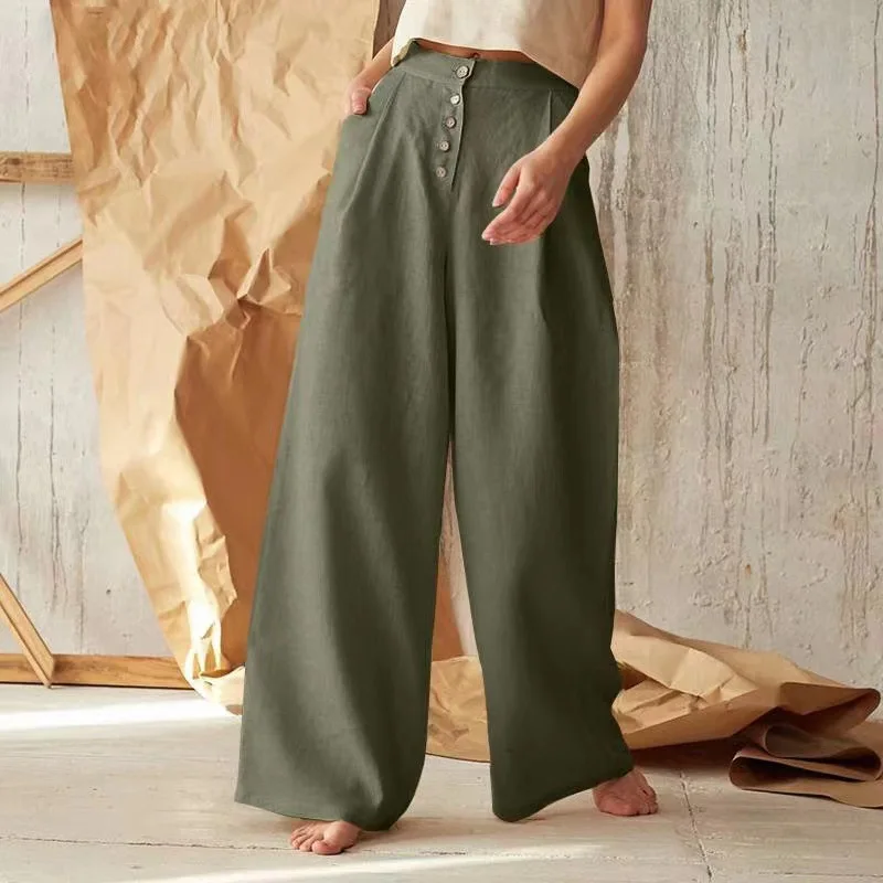 Casual Solid Color Loose Style Linen and Cotton Wide Leg Pant Women