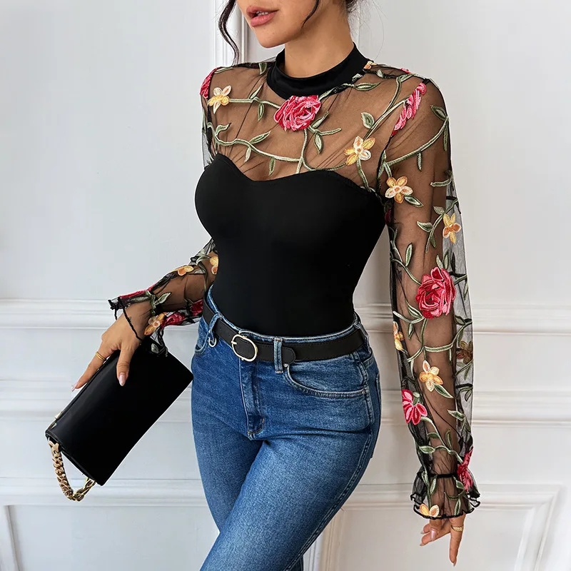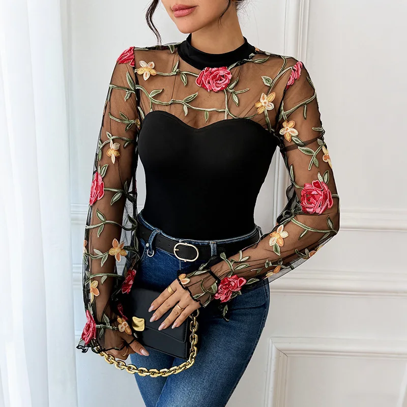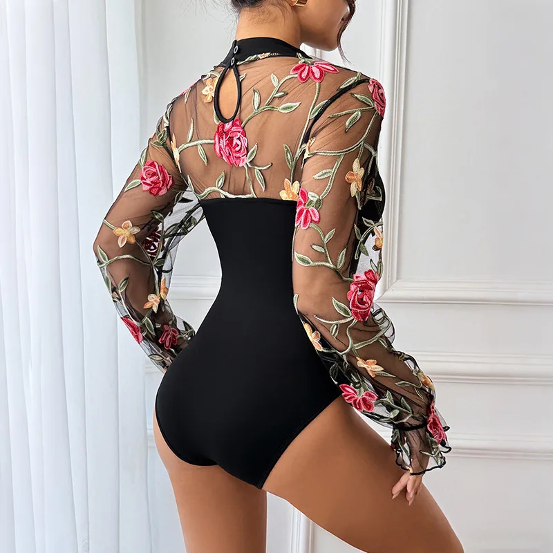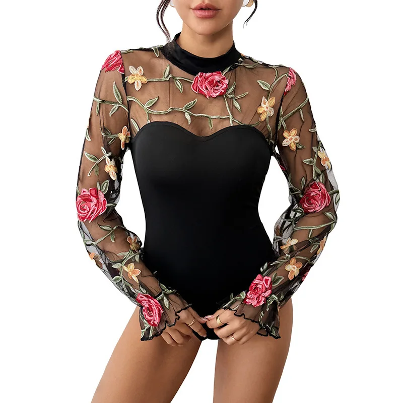 Sexy and sweet lace embroidered transparent one-piece dress, semi-high neck party and party tight one-piece top