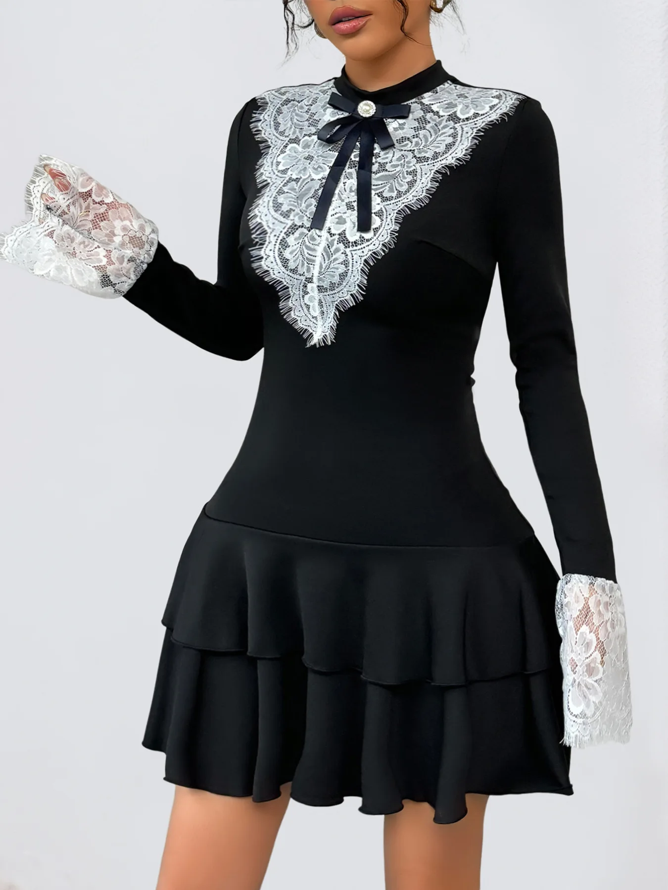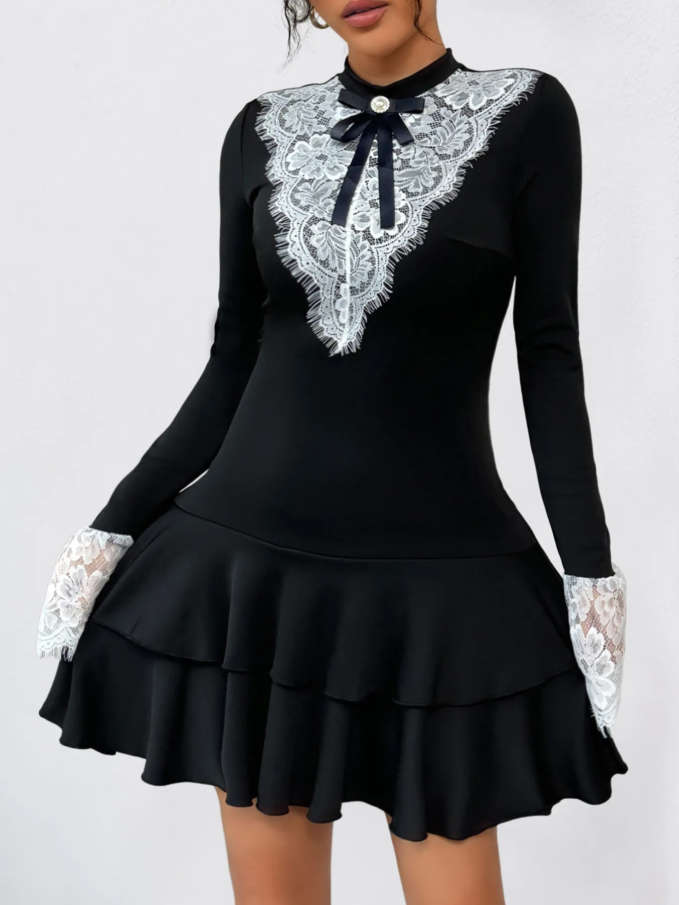 Autumn's new lace-stitched retro French mini party skirt with bow for women, light dress and cake dress