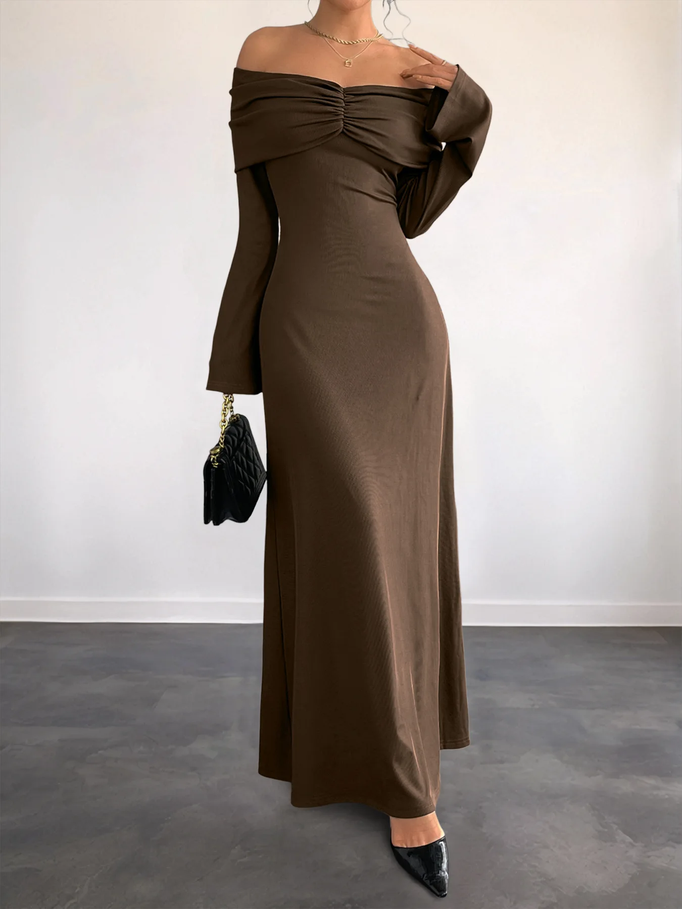 The 2025 Autumn New High-end Brown One-shoulder Slimming Dress with a Mature and Elegant Style for Women