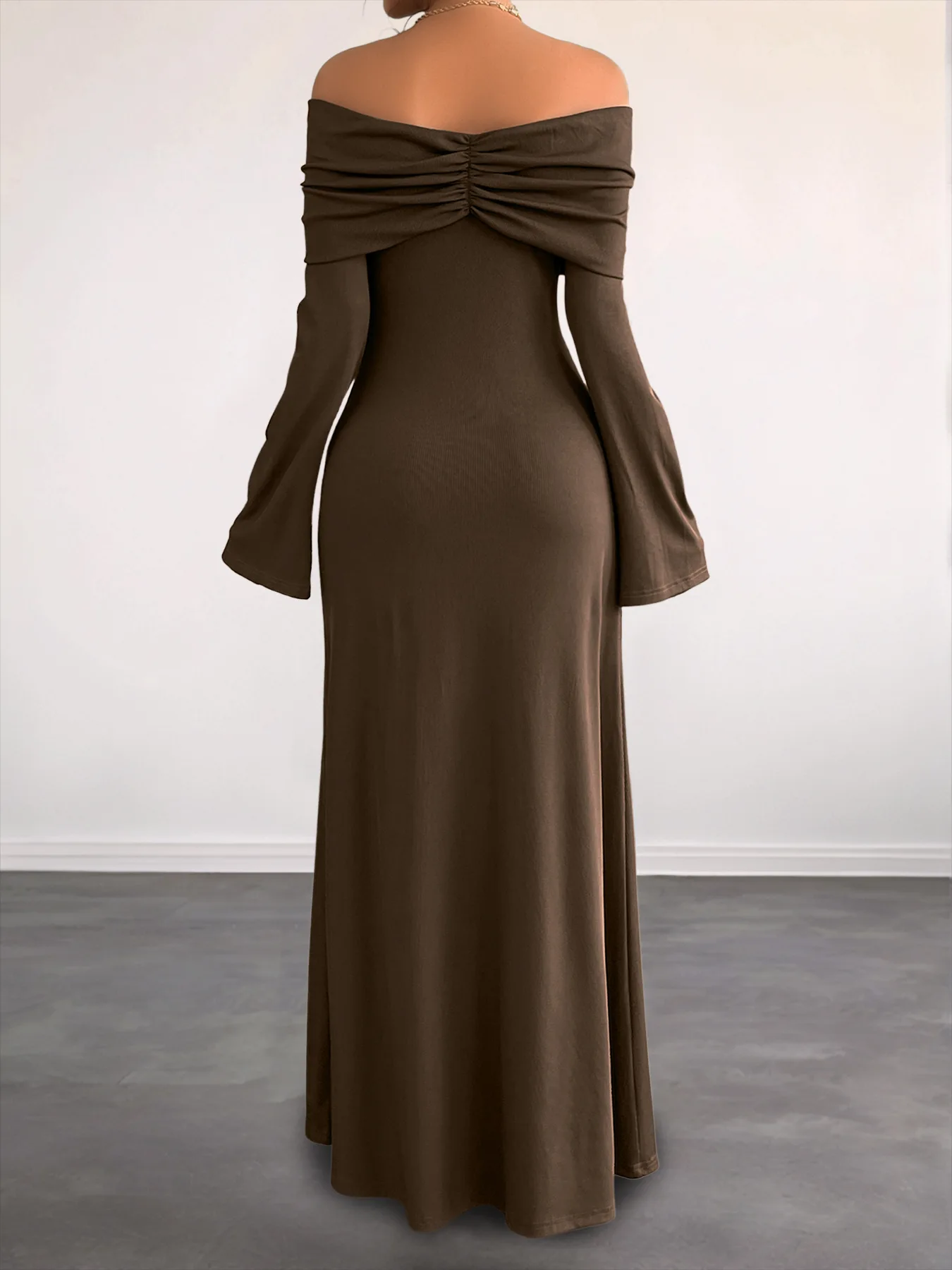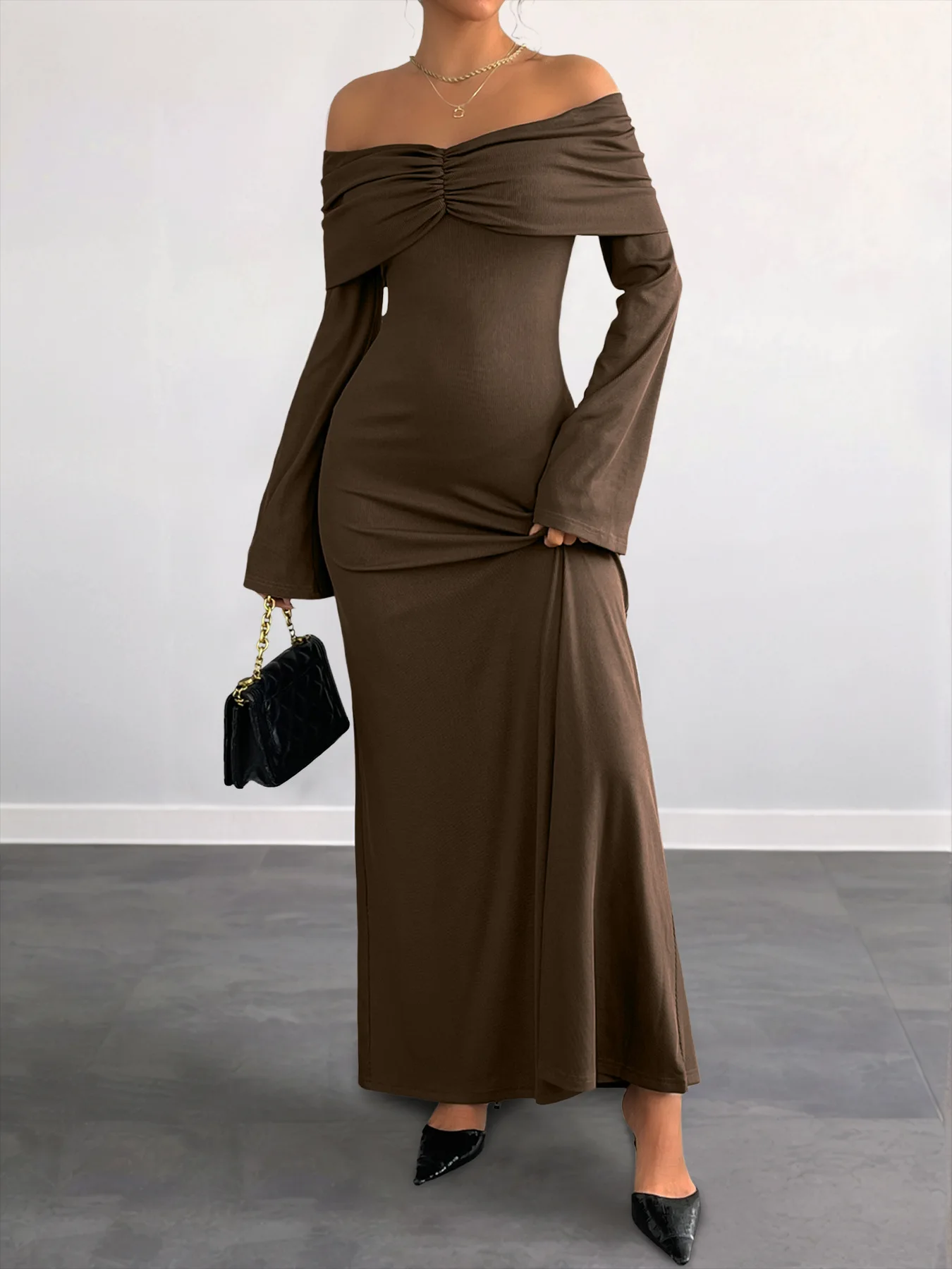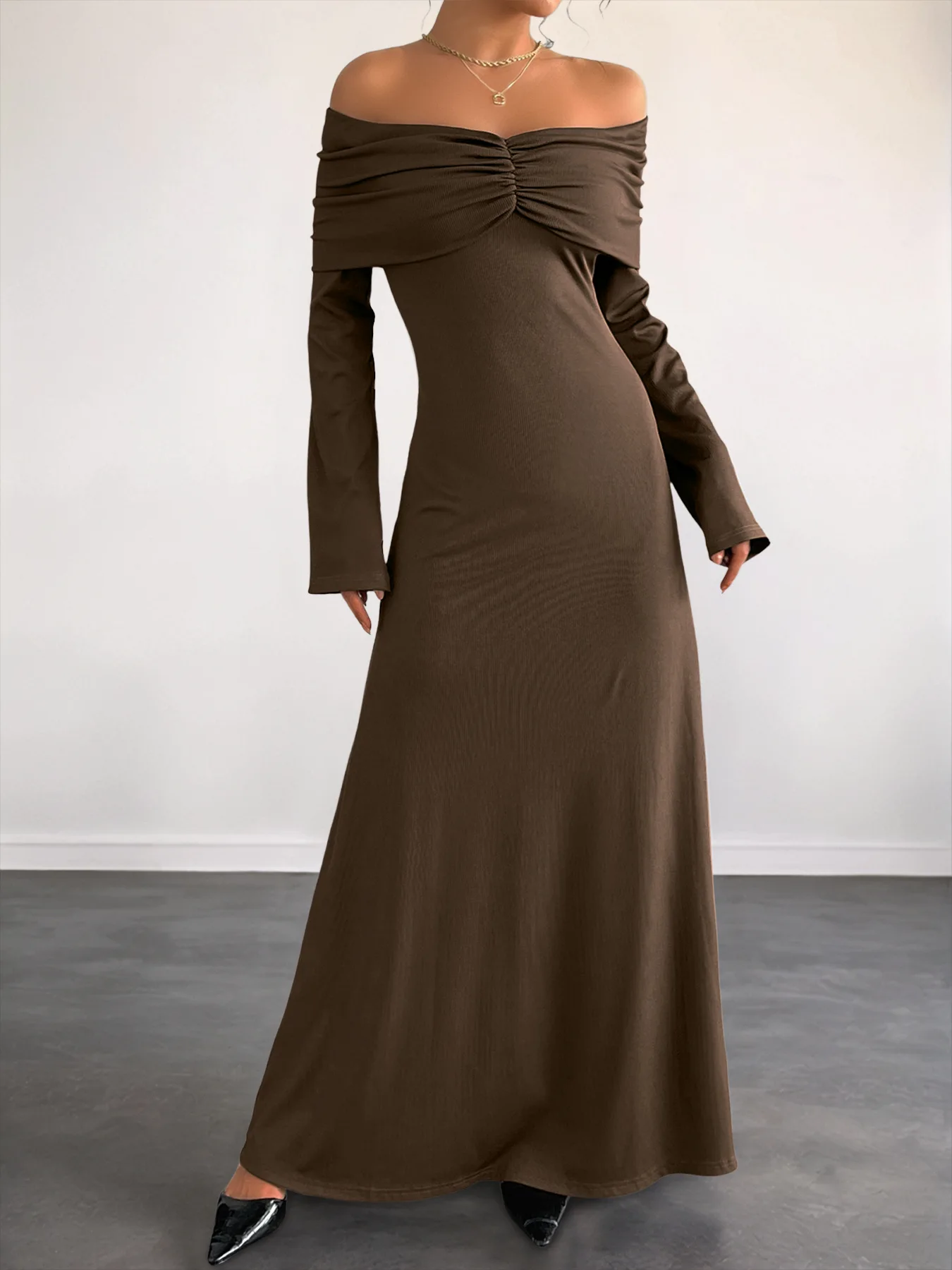 ZYHT 73905 Dusty Rose Off-The-Shoulder Long Sleeve Stretch Jersey Dress Ruched Bodice Floor Length Fish Tail Maxi Dress