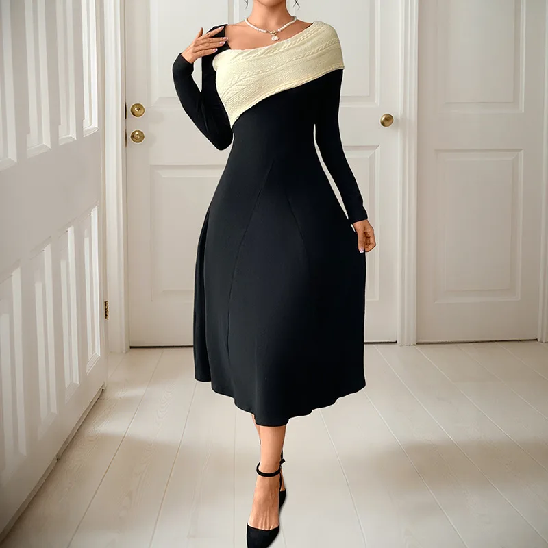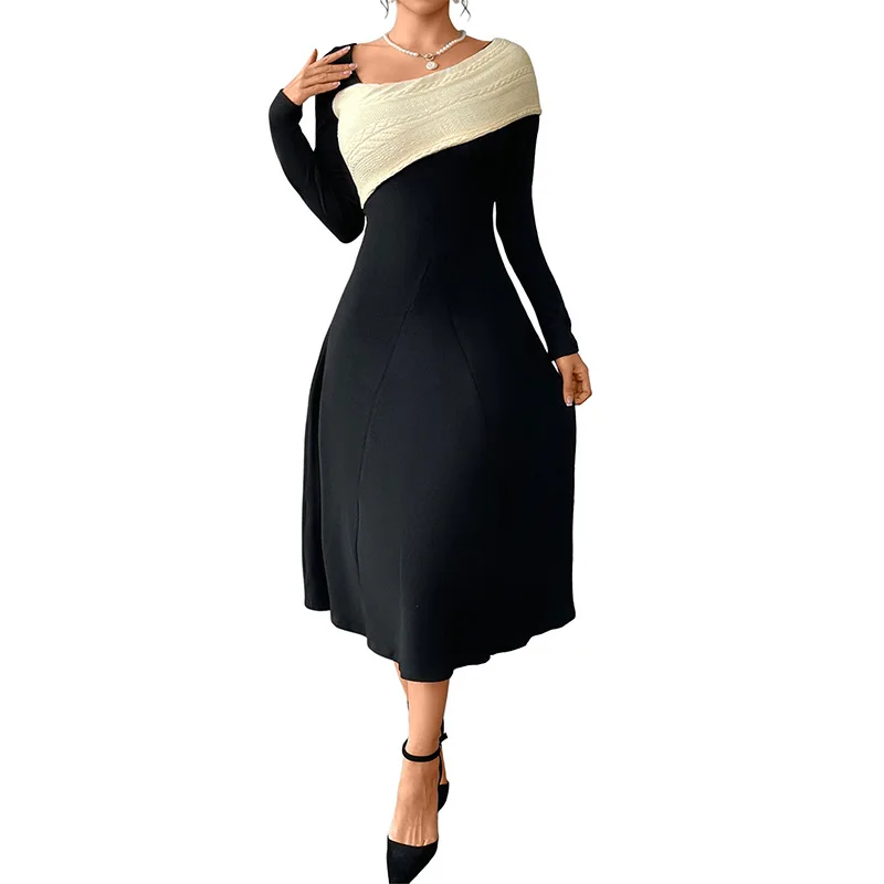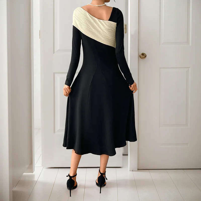 2025 New Cross-border Versatile, Sexy and Elegant, Large-swing Irregular V-neck Color-blocked Dress