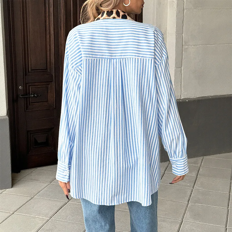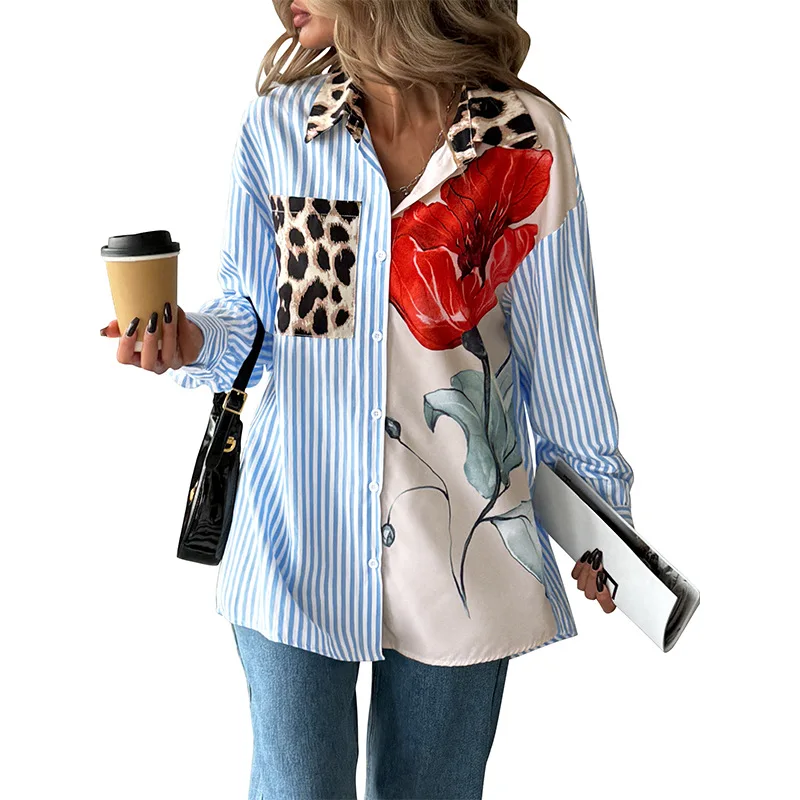 2025 New Autumn Cross-border Casual Vacation Personalized Trendy Style Printed Striped Patchwork Shirt for Women