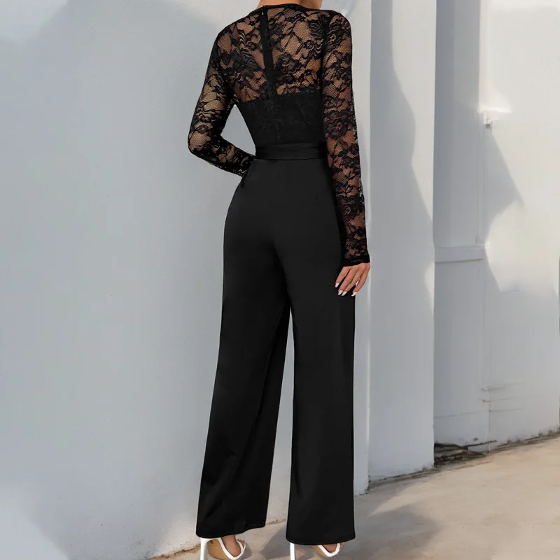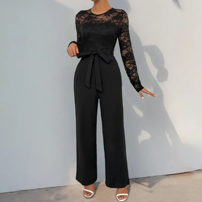 Ladies' long-sleeved jumpsuits in solid color, form-fitting lace, elegant office lace-up jumpsuits