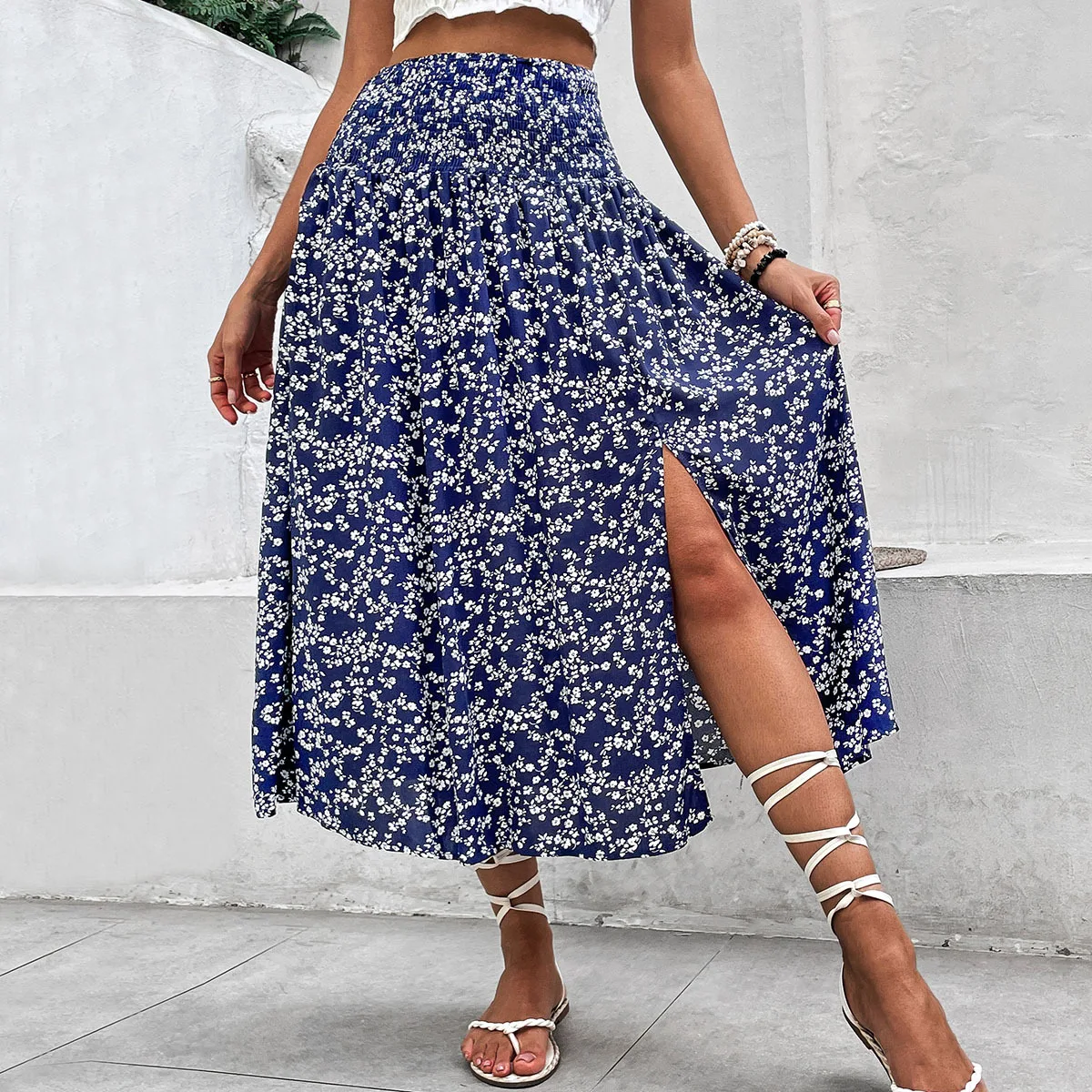 The 2025 summer blue printed slit skirt with a tight waist and elegant vacation floral print dress is a bestseller for women