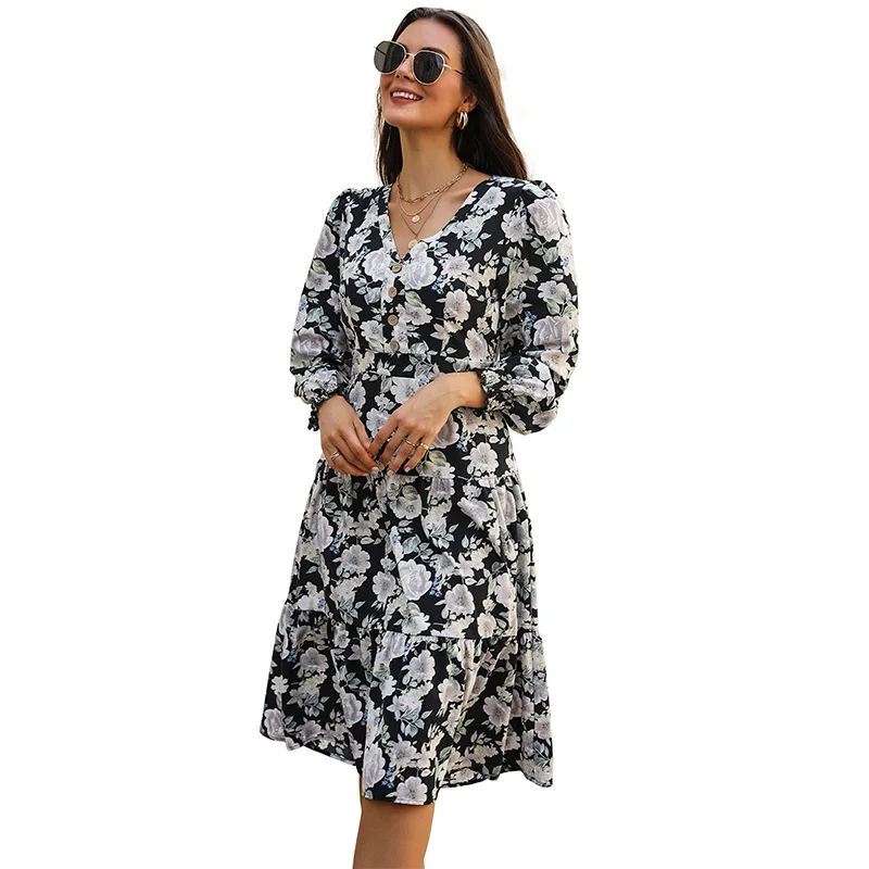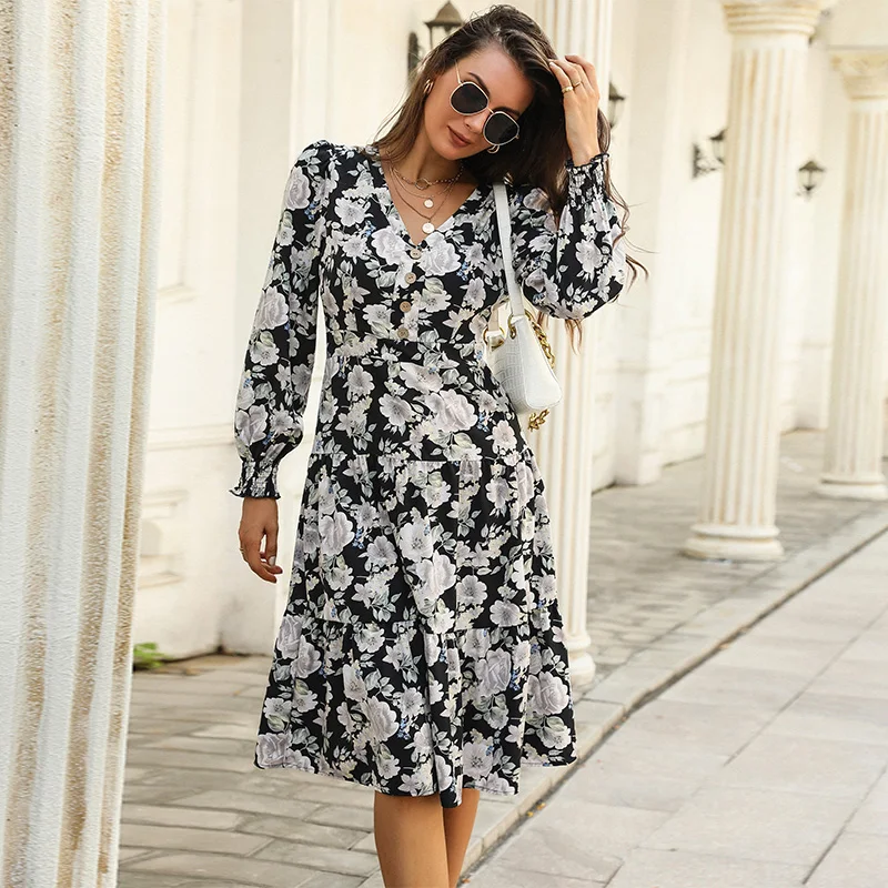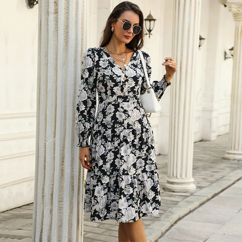 A V-neck floral print long-sleeved dress for women in autumn