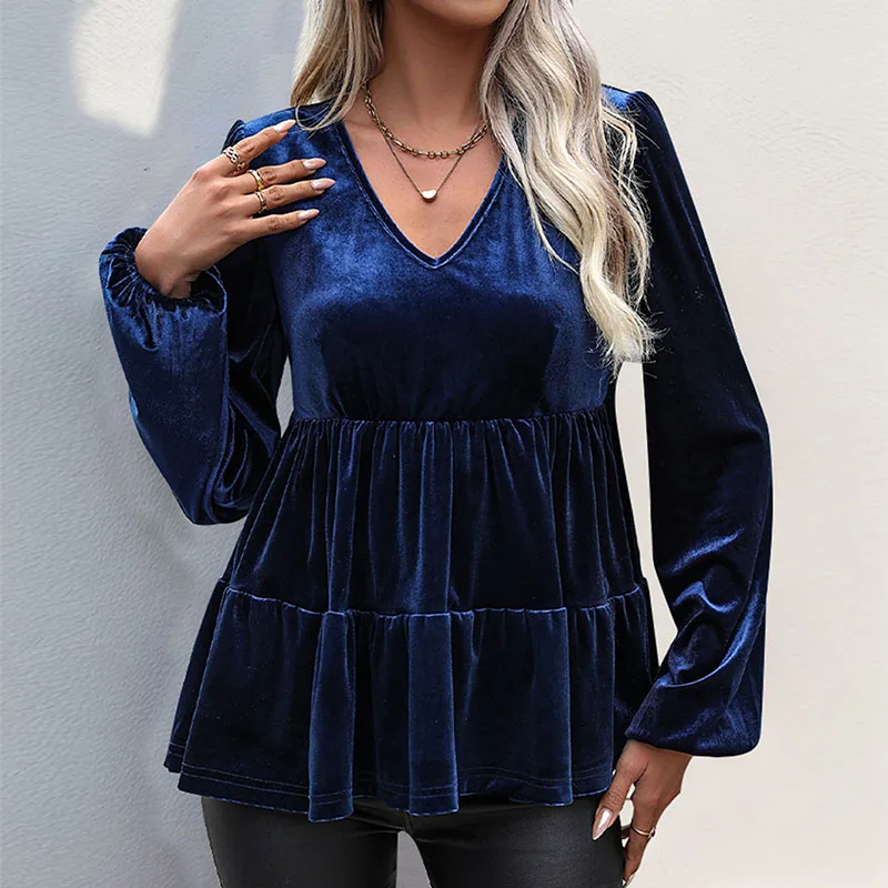 Fashion Design Hem Puff Sleeve V Neck Dark Blue Velvet Blouse for Women