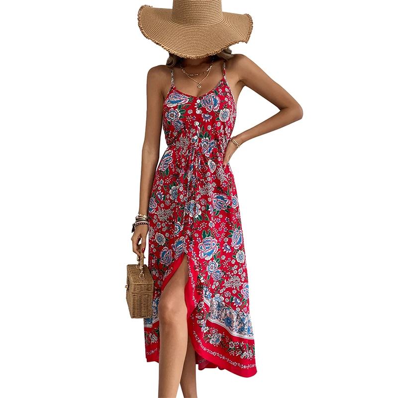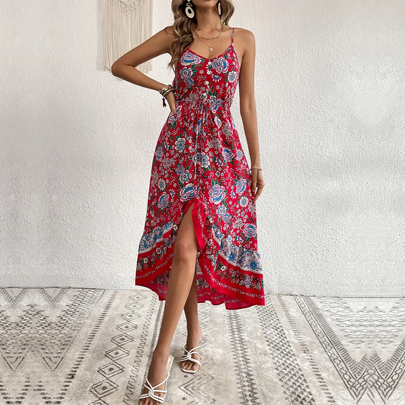 Women Sexy Spaghetti Strap Bohemian Floral Print V Neck Midi Dress Summer Boho Beach Wear Dresses