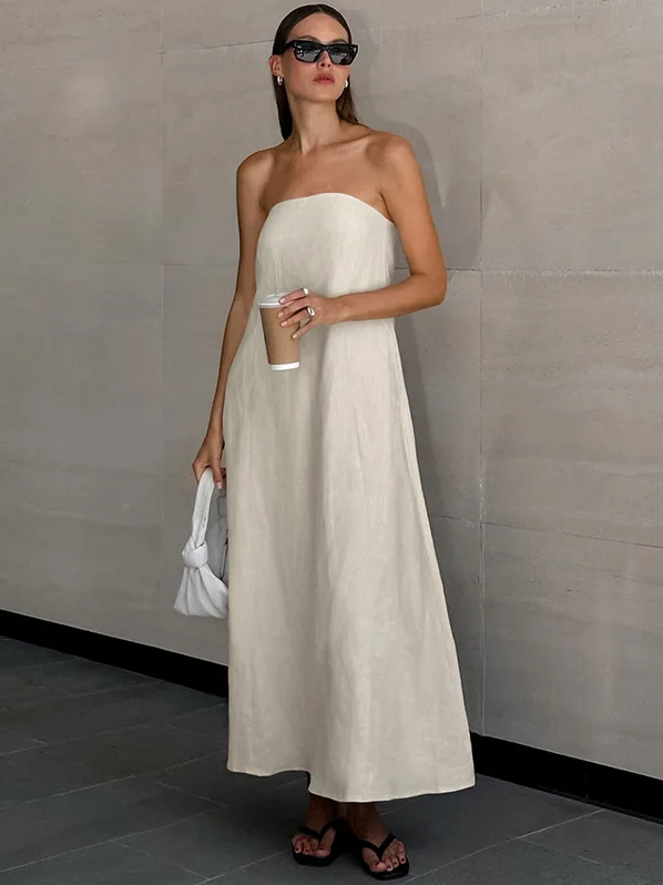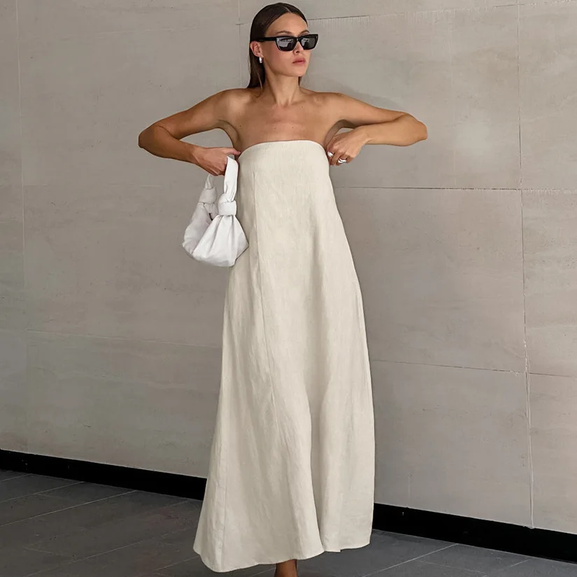French Khaki Cotton Linen Strapless Vacation Style High Waisted Dress with Exposed Back 2025 Summer New Long Skirt for Women