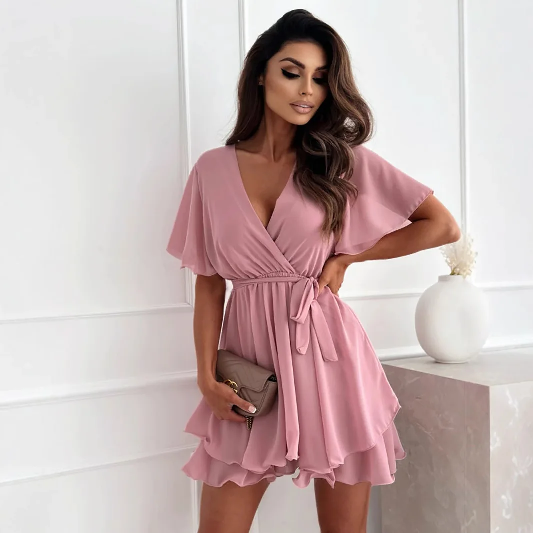 2025 Summer European and American Women's New V-neck Chiffon Dress with Strap up Waist and Lotus Leaf Edge