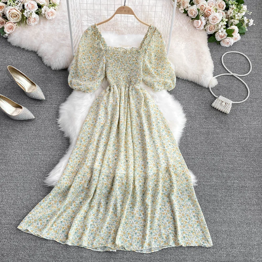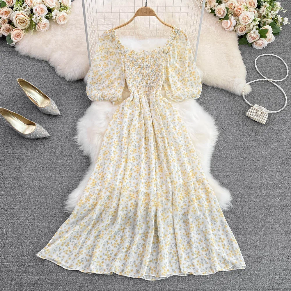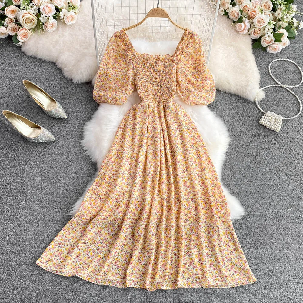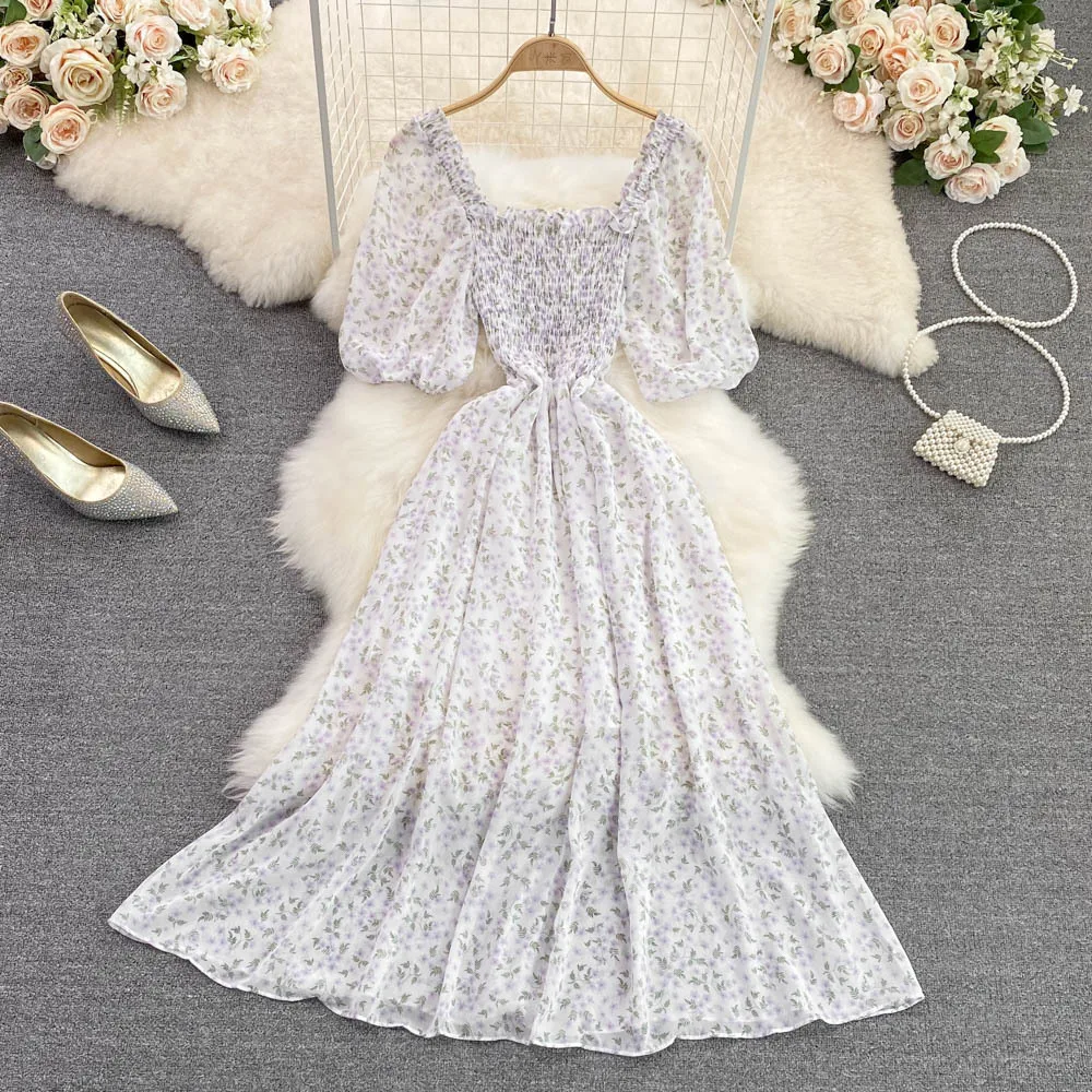 Summer 2025 New square Collar Floral Chiffon Casual Jumpsuit Floral Skirt A-line Dress