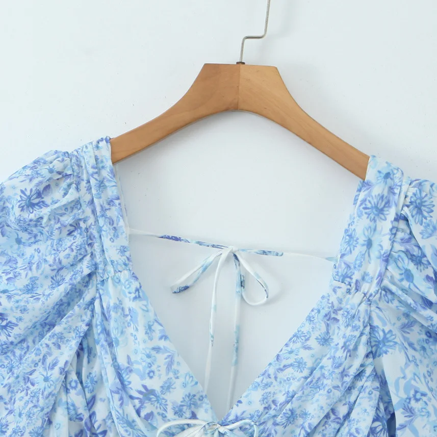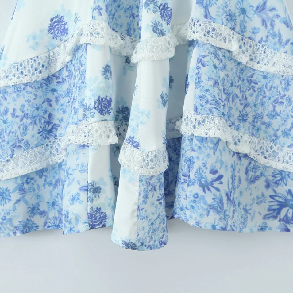 Hot Selling Women's Blue and White Porcelain Floral Lace Patchwork V-neck Waist Cinching Dress